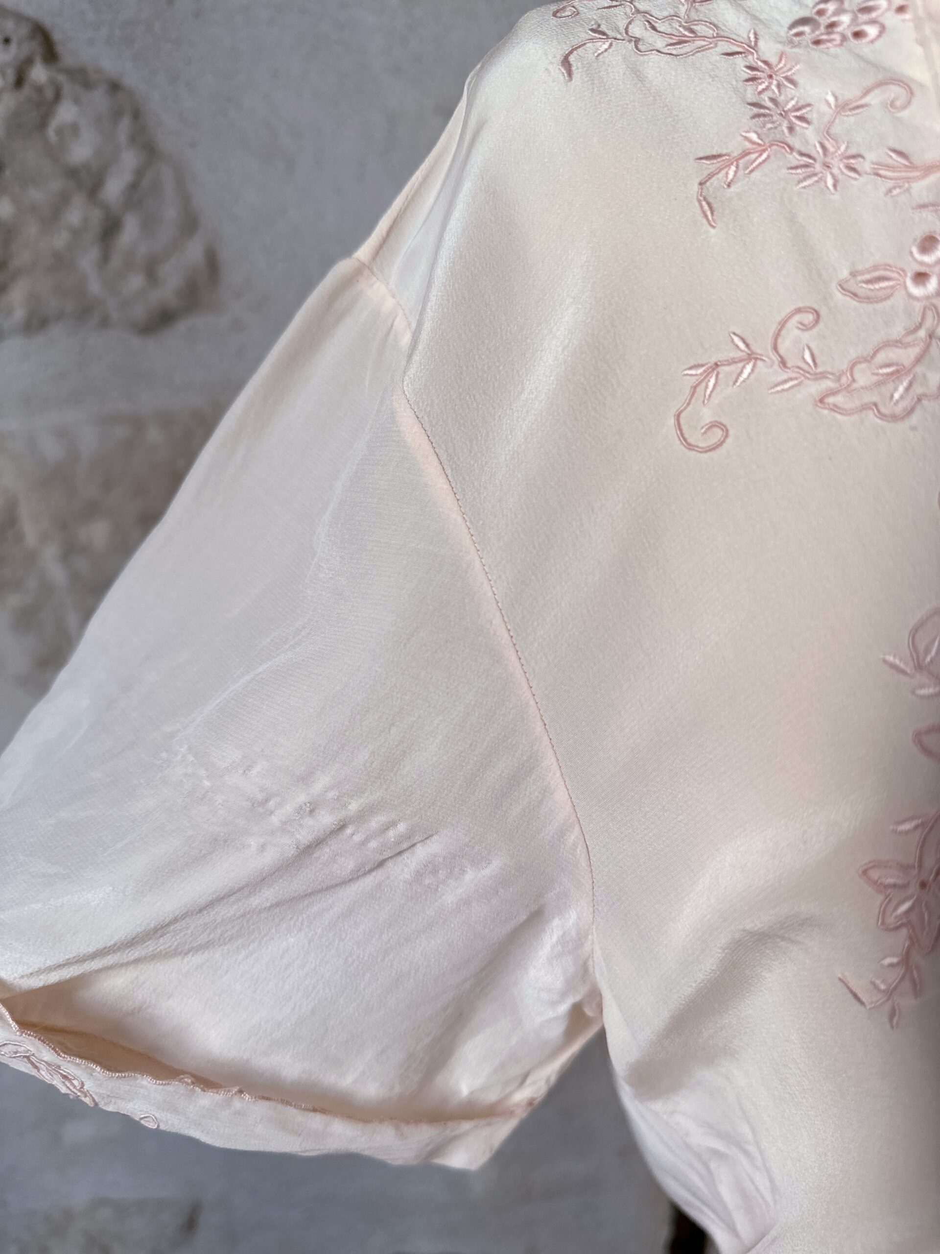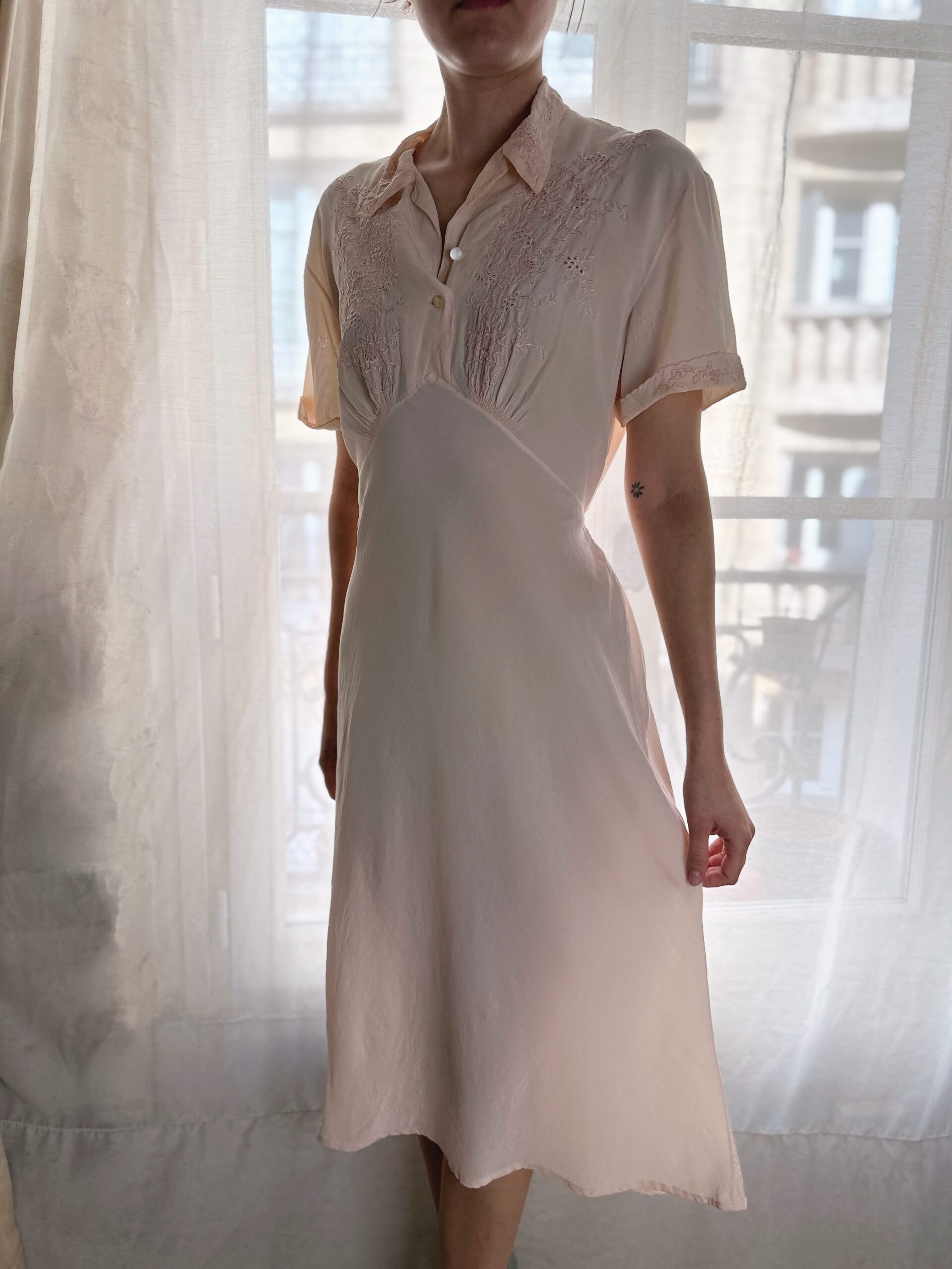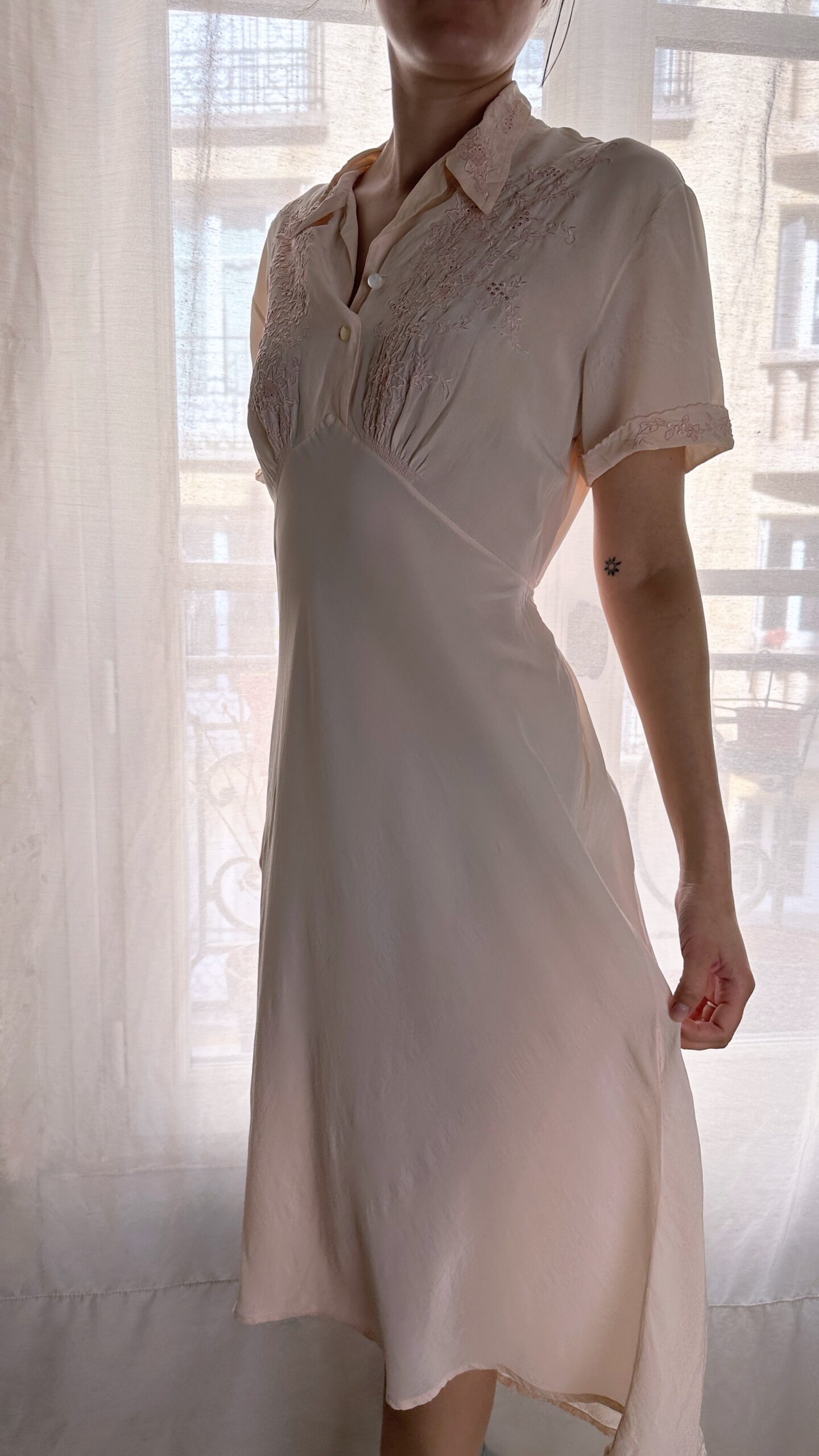 Vintage silk dress with 1930’s silhouette. Bias cut, buttery soft silk crepe and incredible hand embroidered florals. Drapes beautifully and moves like water.