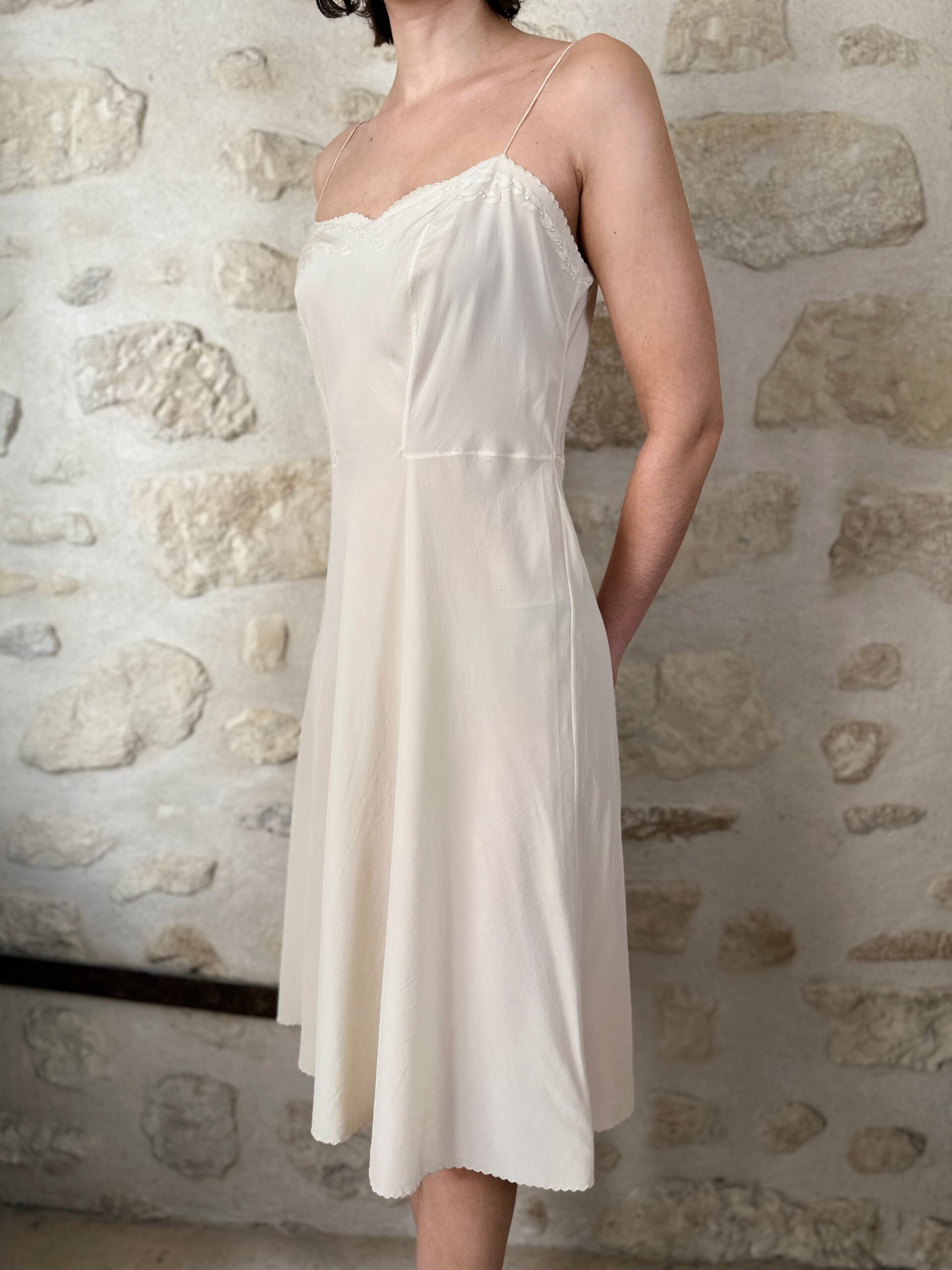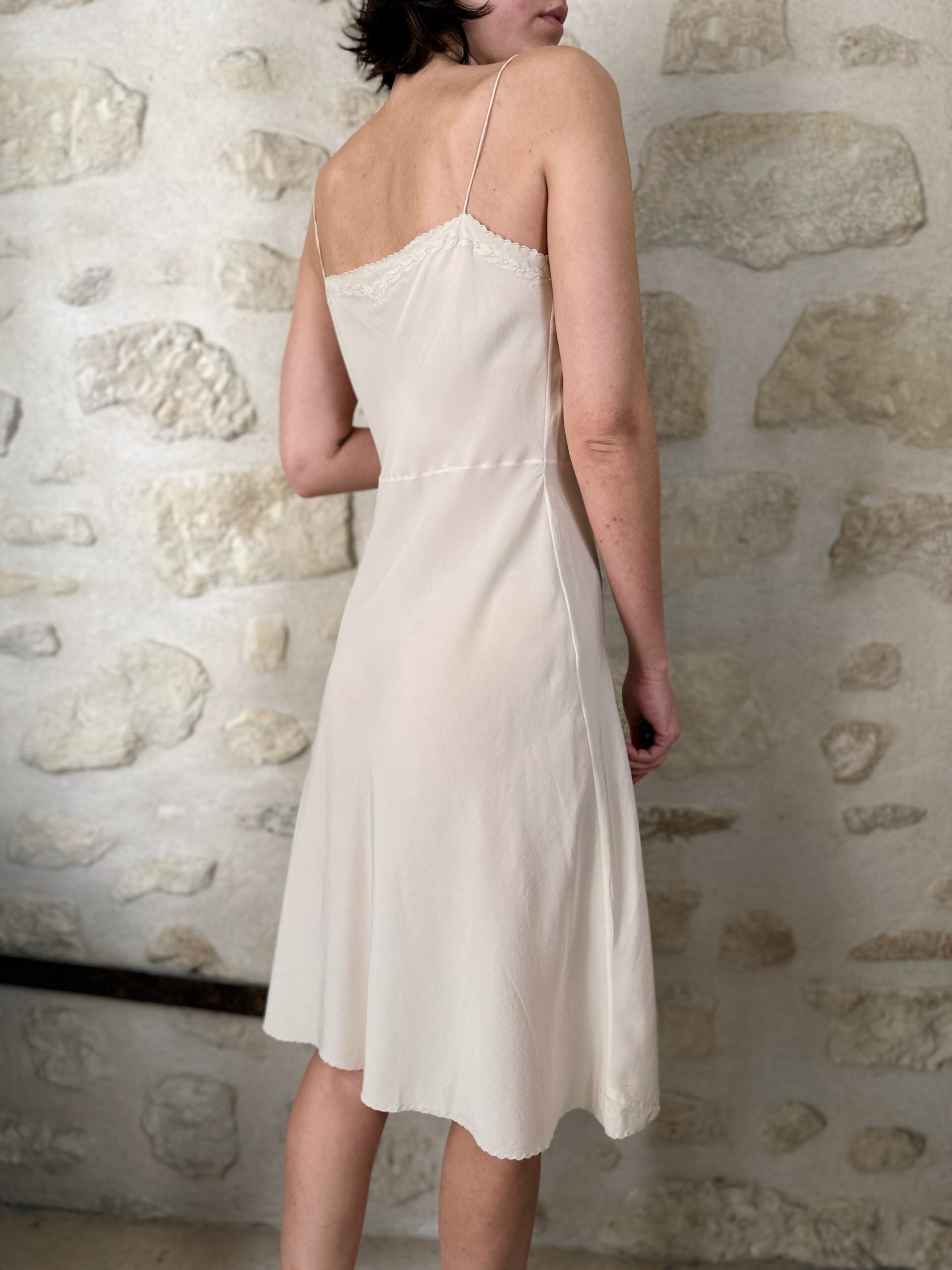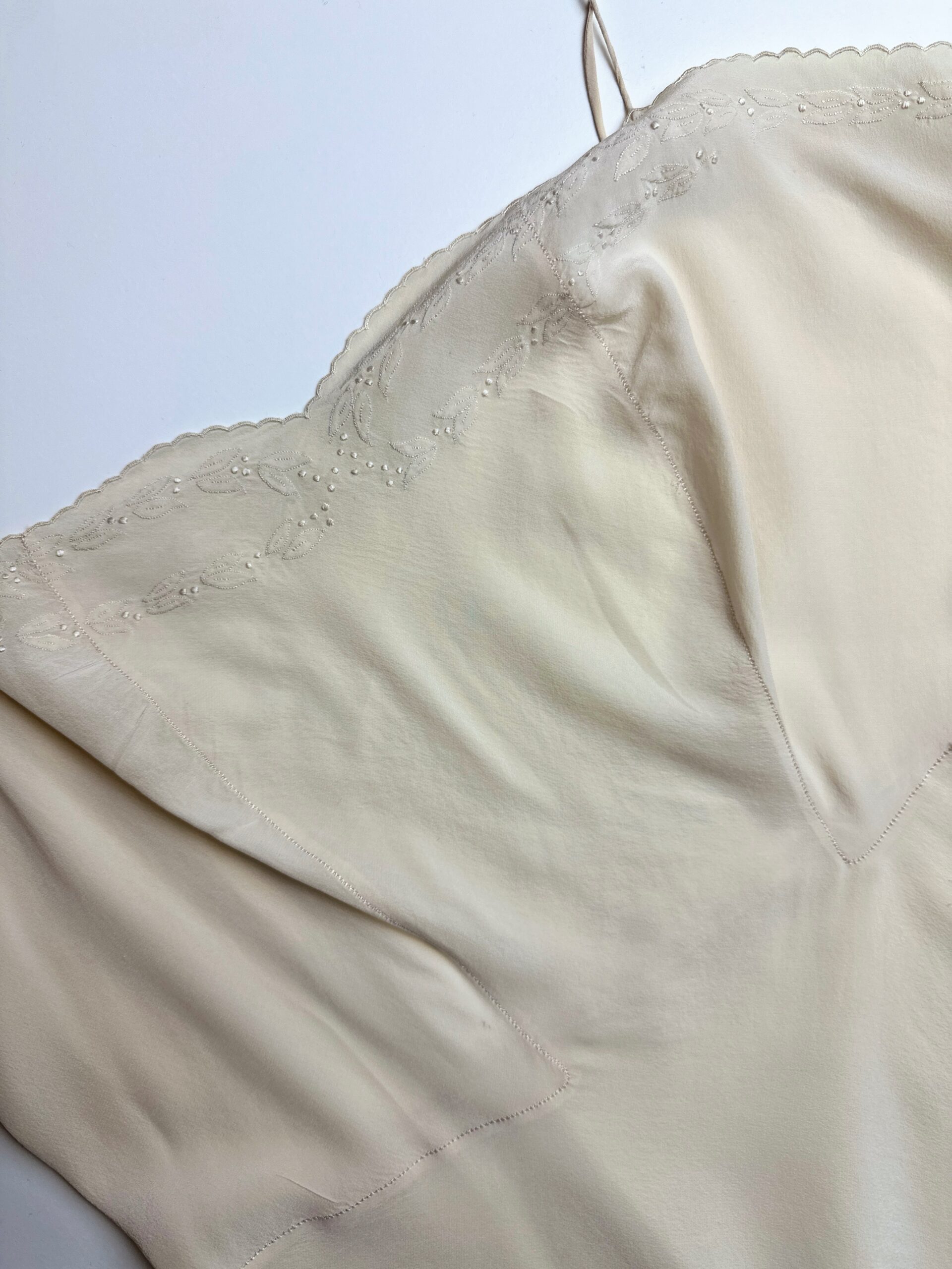 Silk that moves like water. This pure natural silk slip dress with delicate hand-embroidered details on the neckline. Buttery soft.