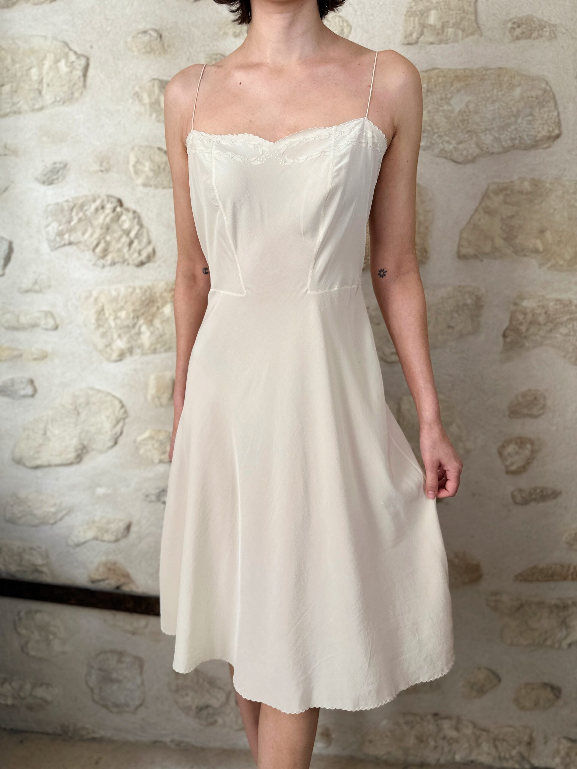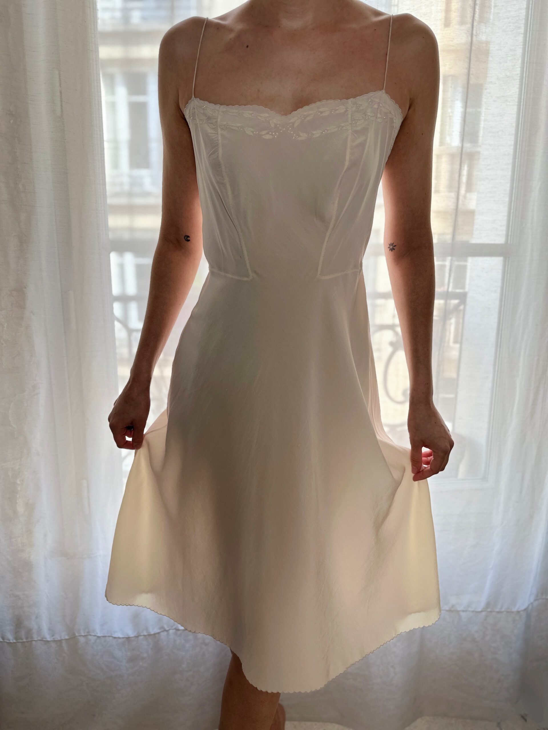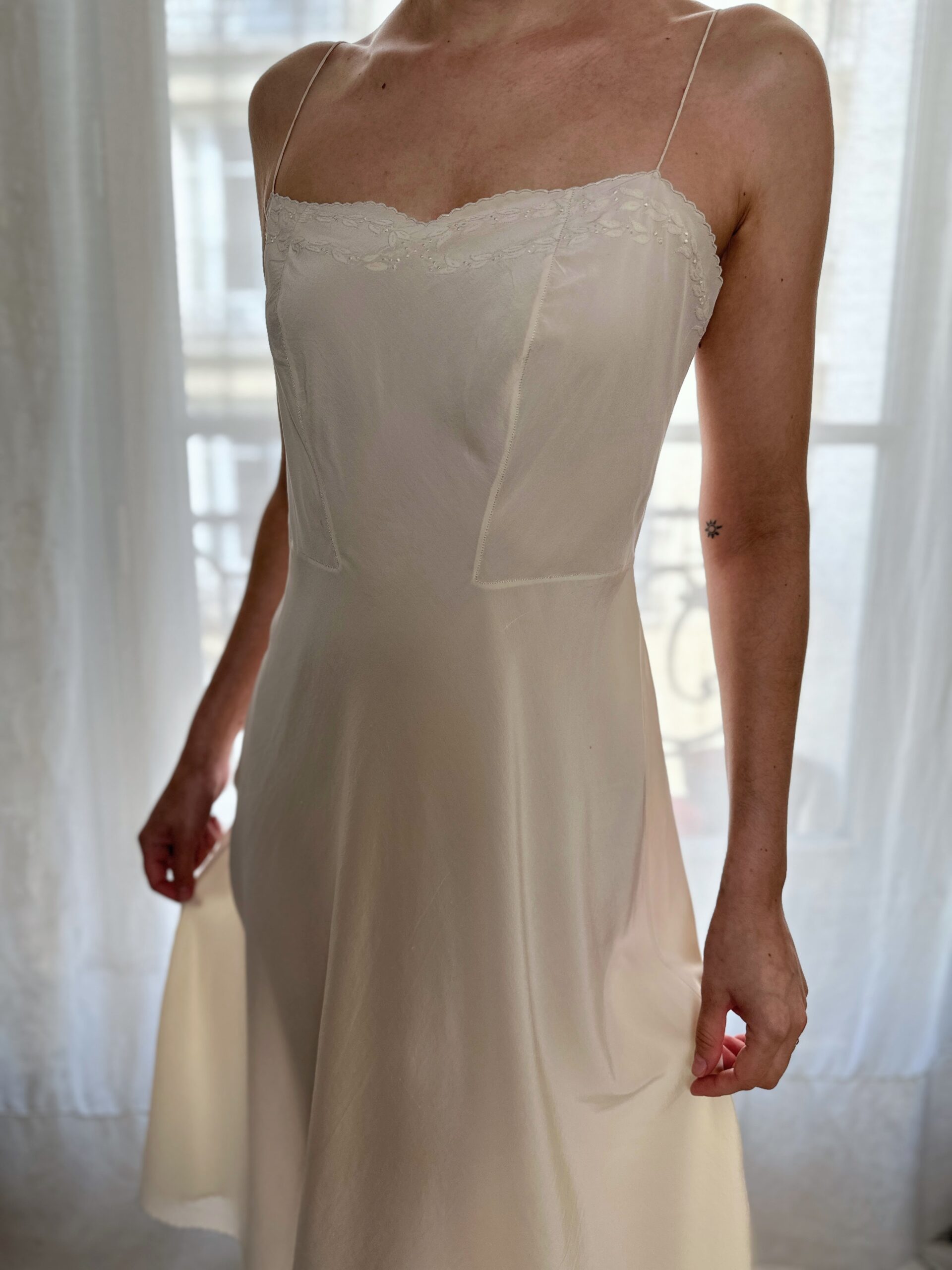 Silk that moves like water. This pure natural silk slip dress with delicate hand-embroidered details on the neckline. Buttery soft.