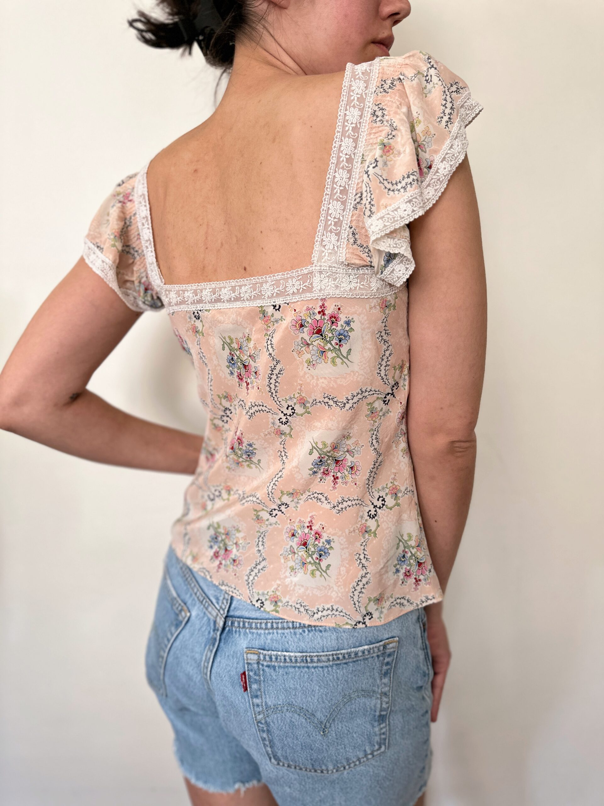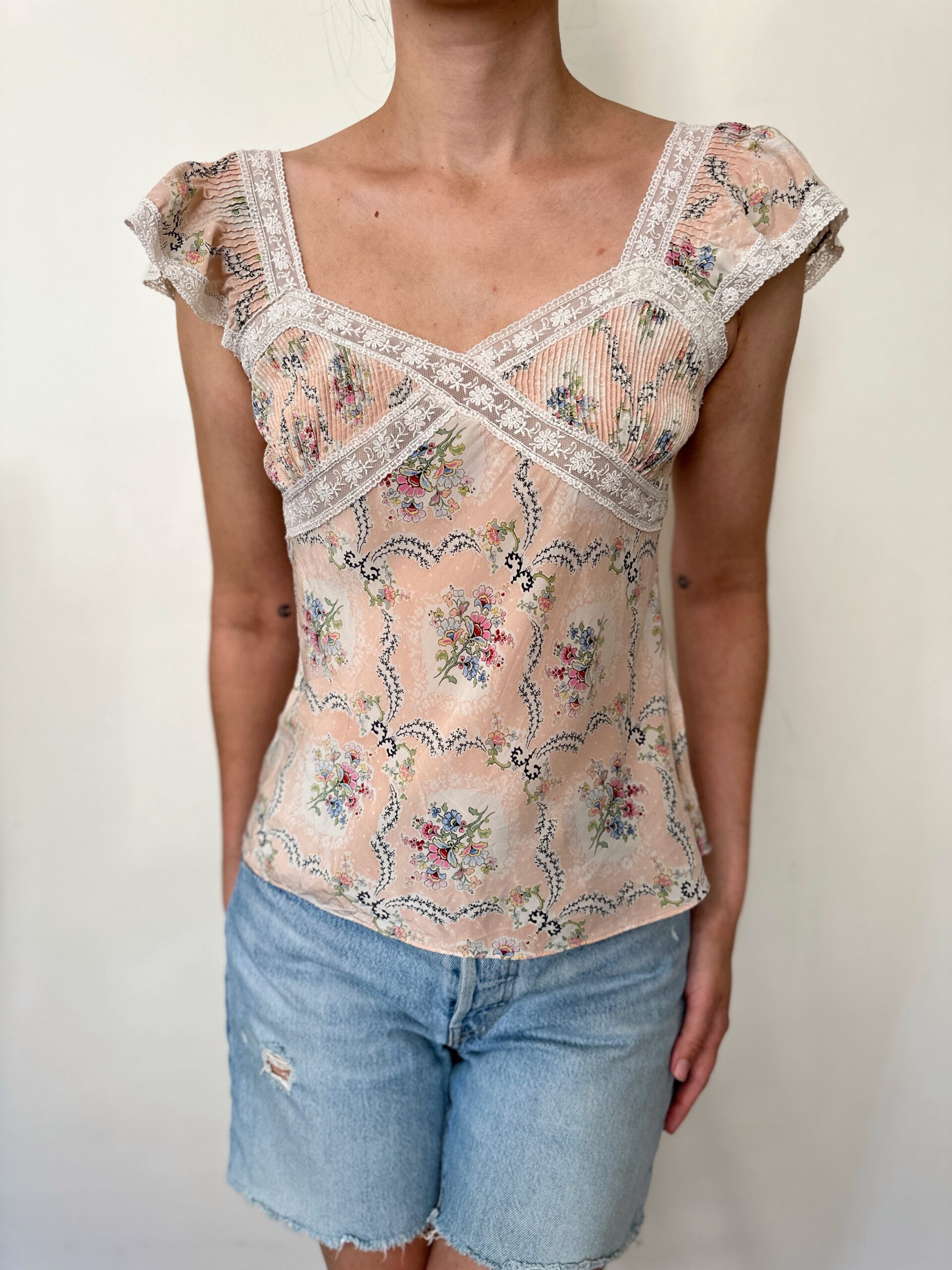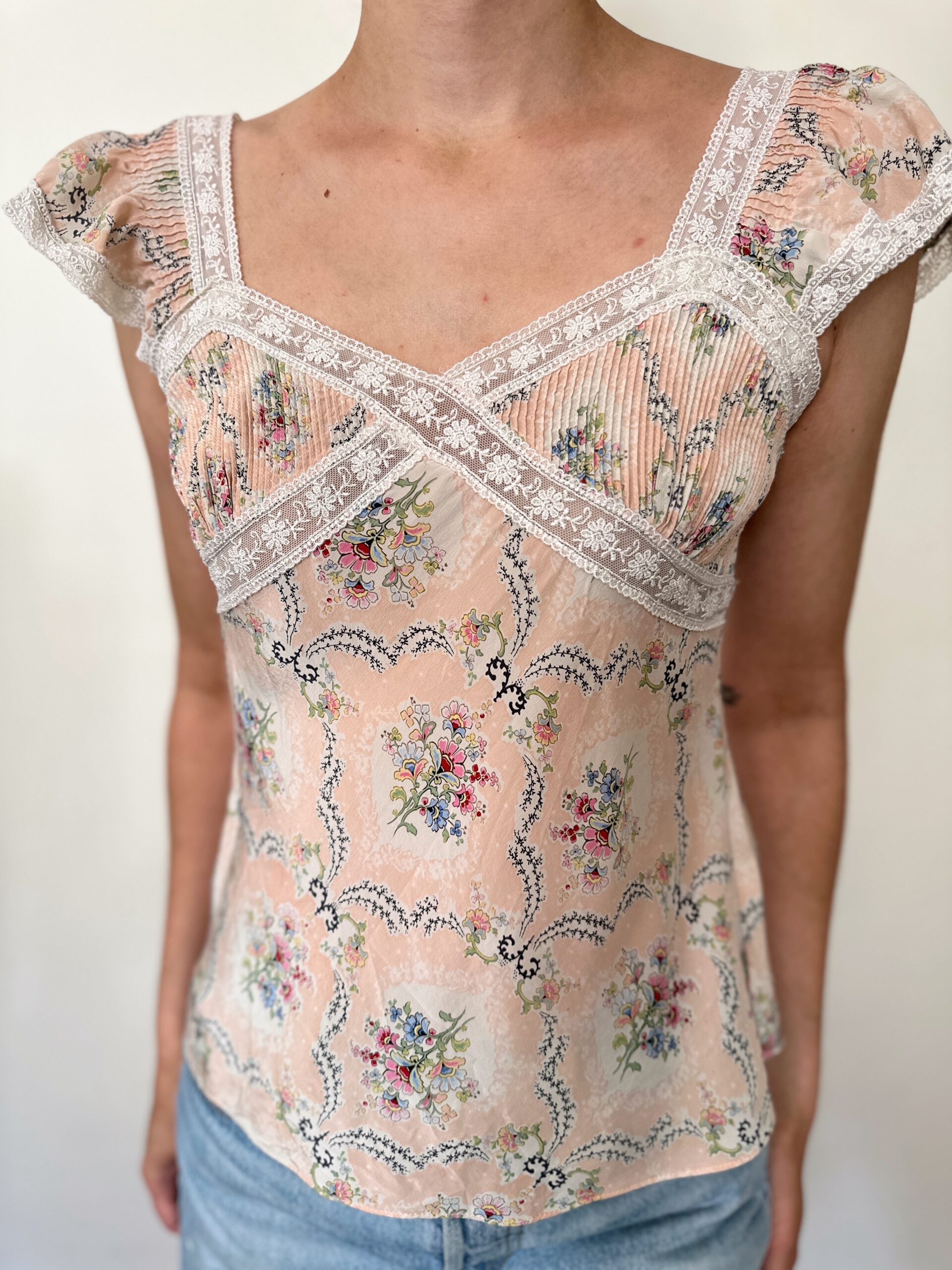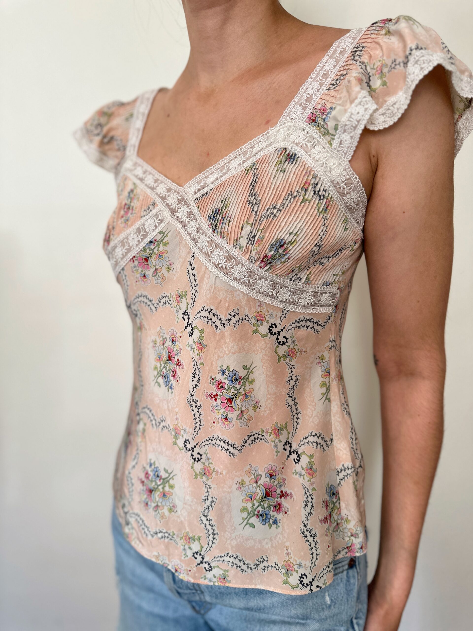 Pure silk blouse from Paul & Joe, paisley floral print with delicate pintuck pleats on the bust. Playful sheer lace.