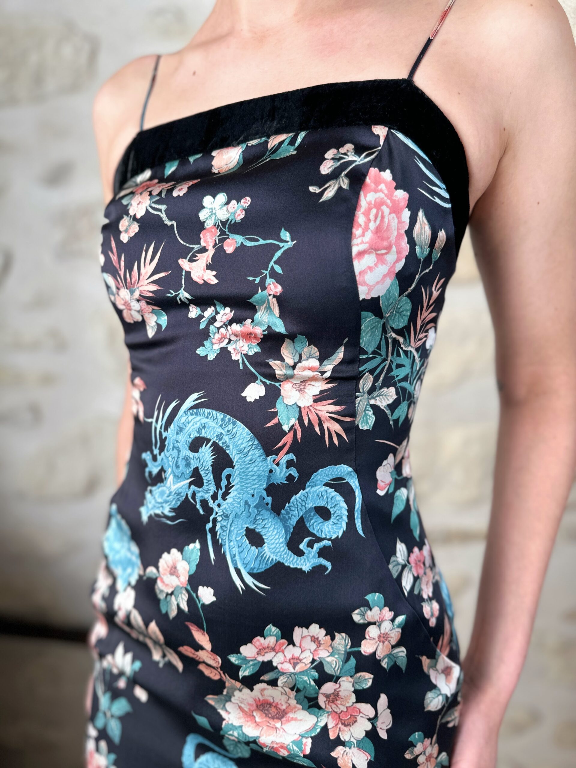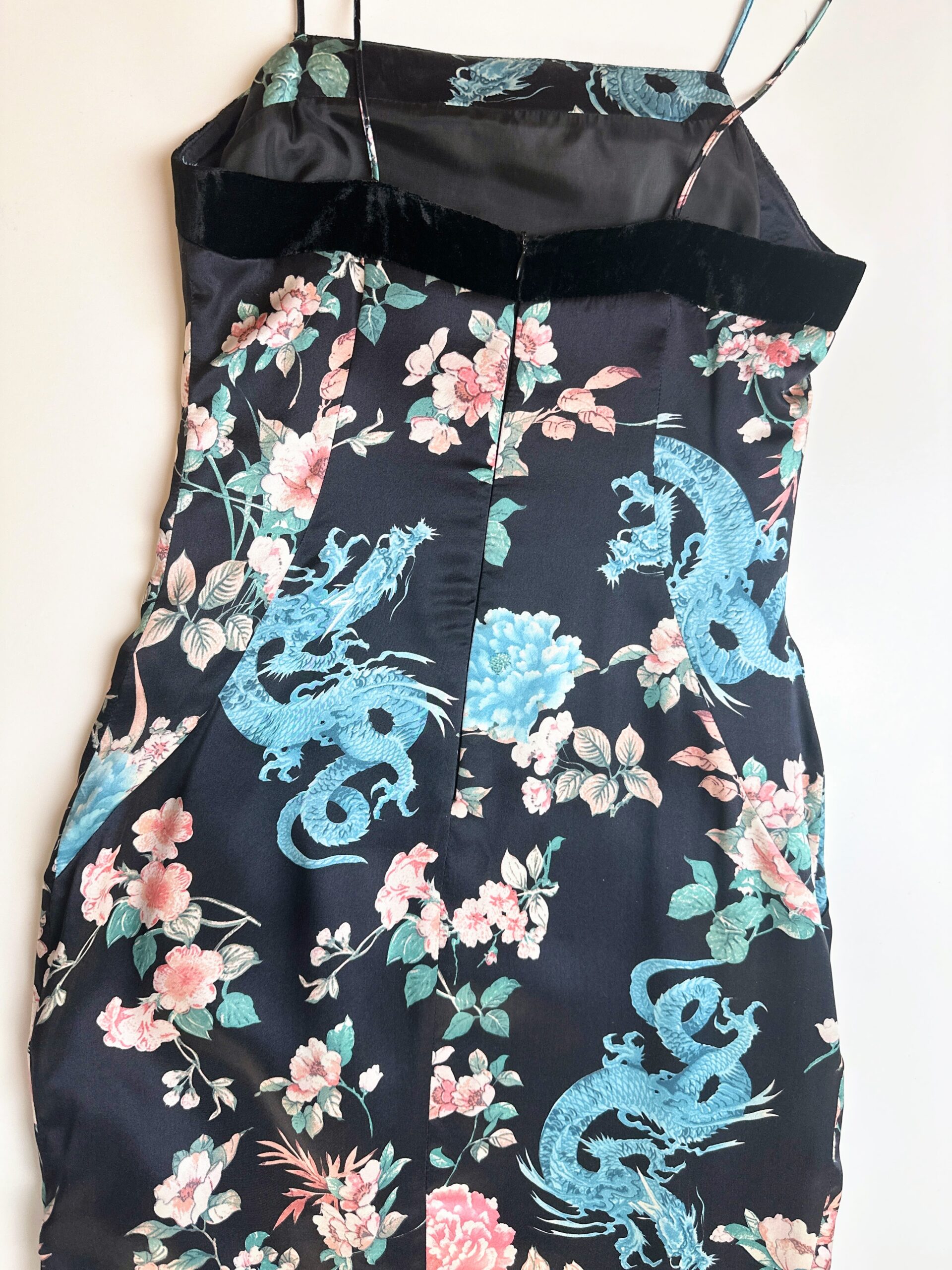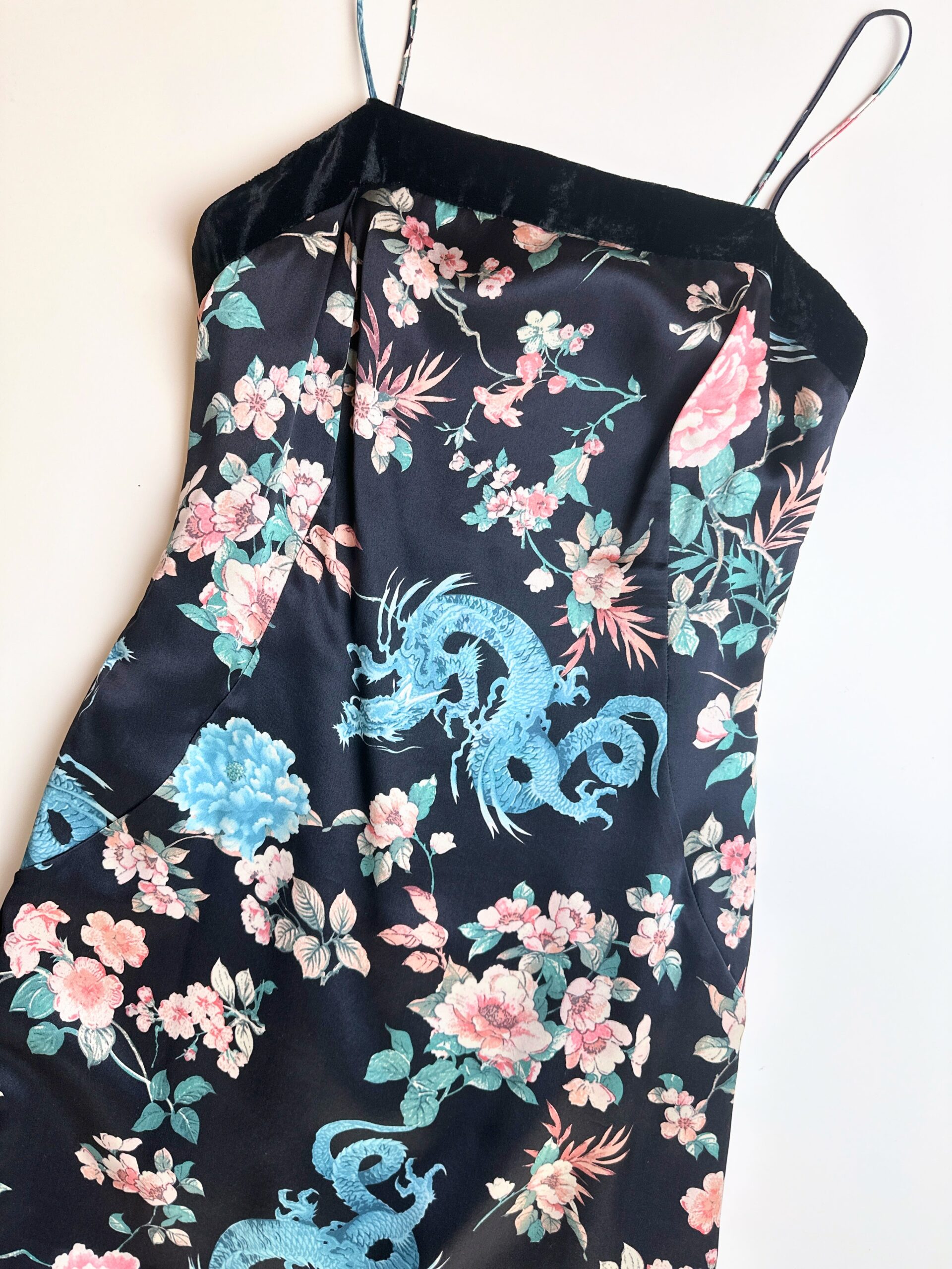 Gorgeous silk dress with traditional Chinese inspired print, featuring dragons, peonies and cherry blossoms. Velvet band across the bust with thin dainty straps. From the early 00’s.