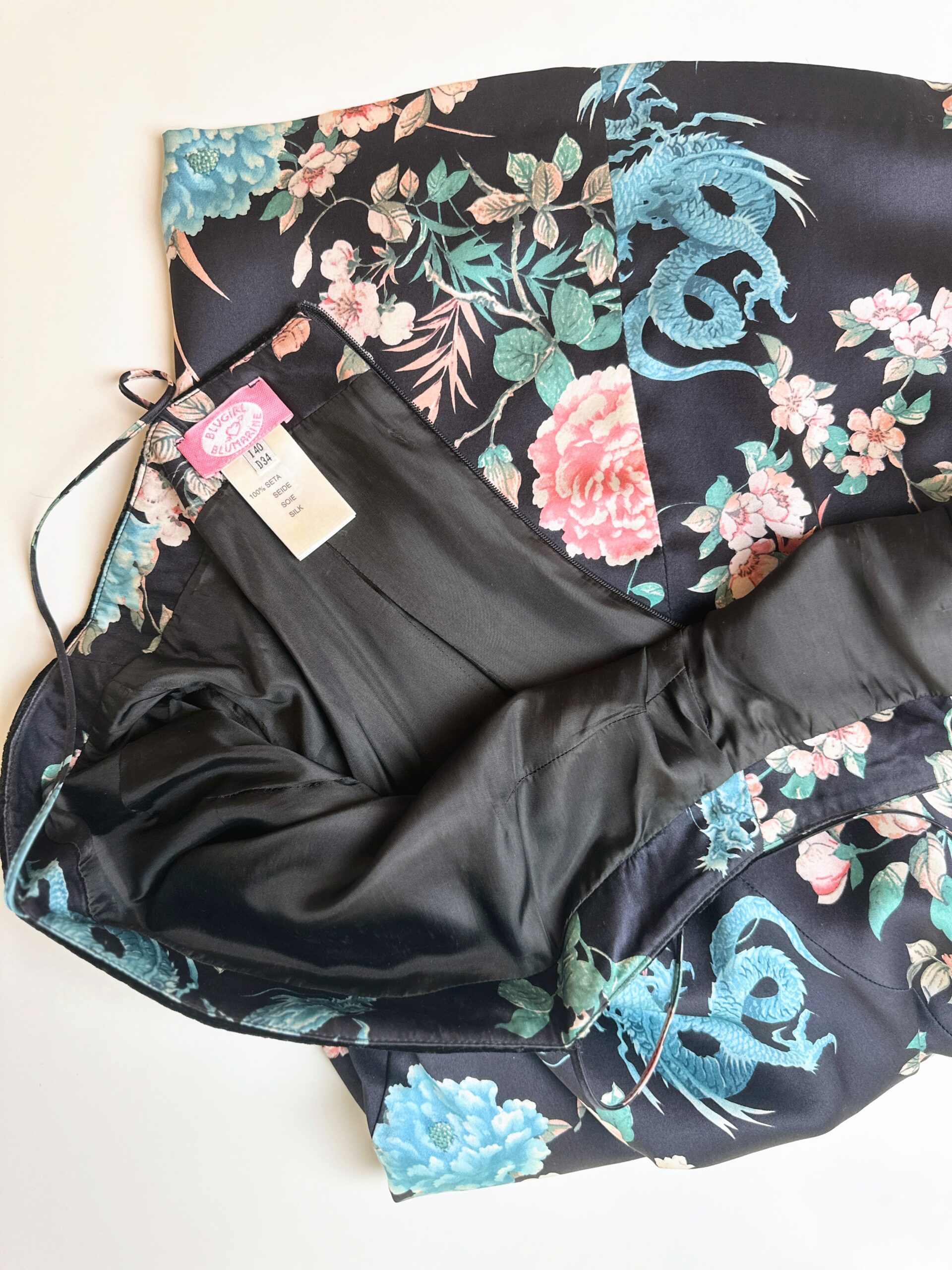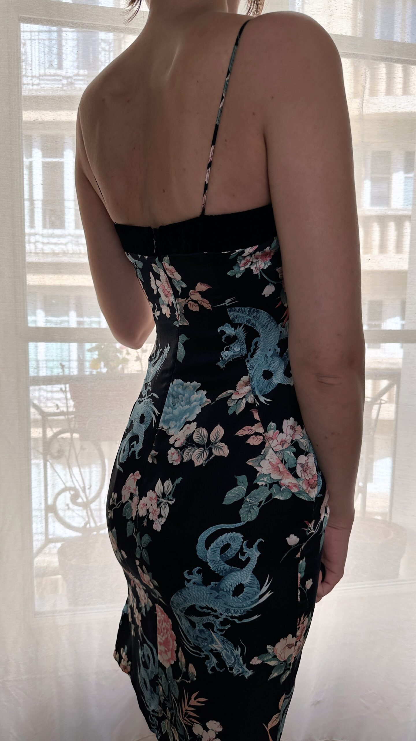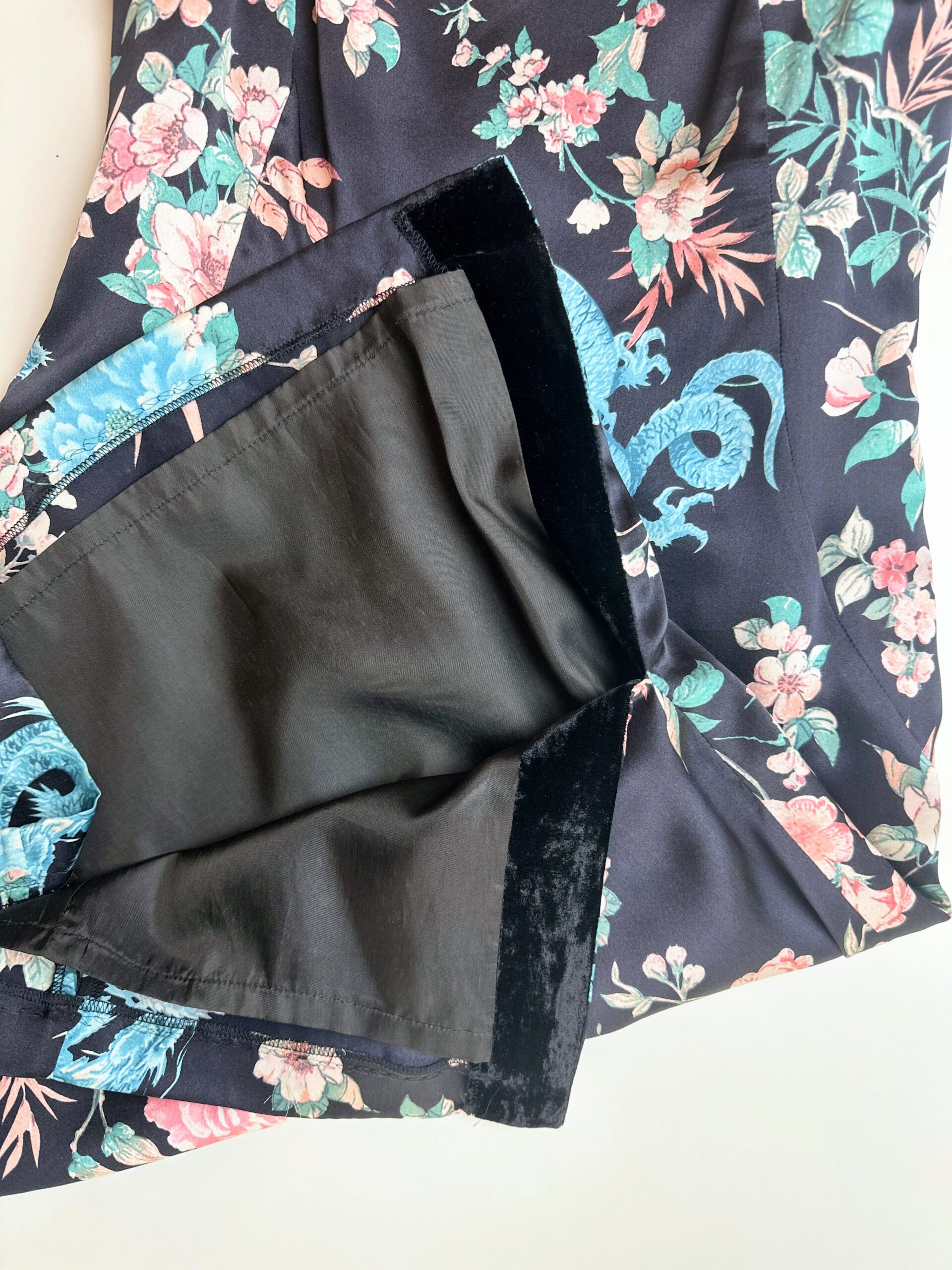 Gorgeous silk dress with traditional Chinese inspired print, featuring dragons, peonies and cherry blossoms. Velvet band across the bust with thin dainty straps. From the early 00’s.
