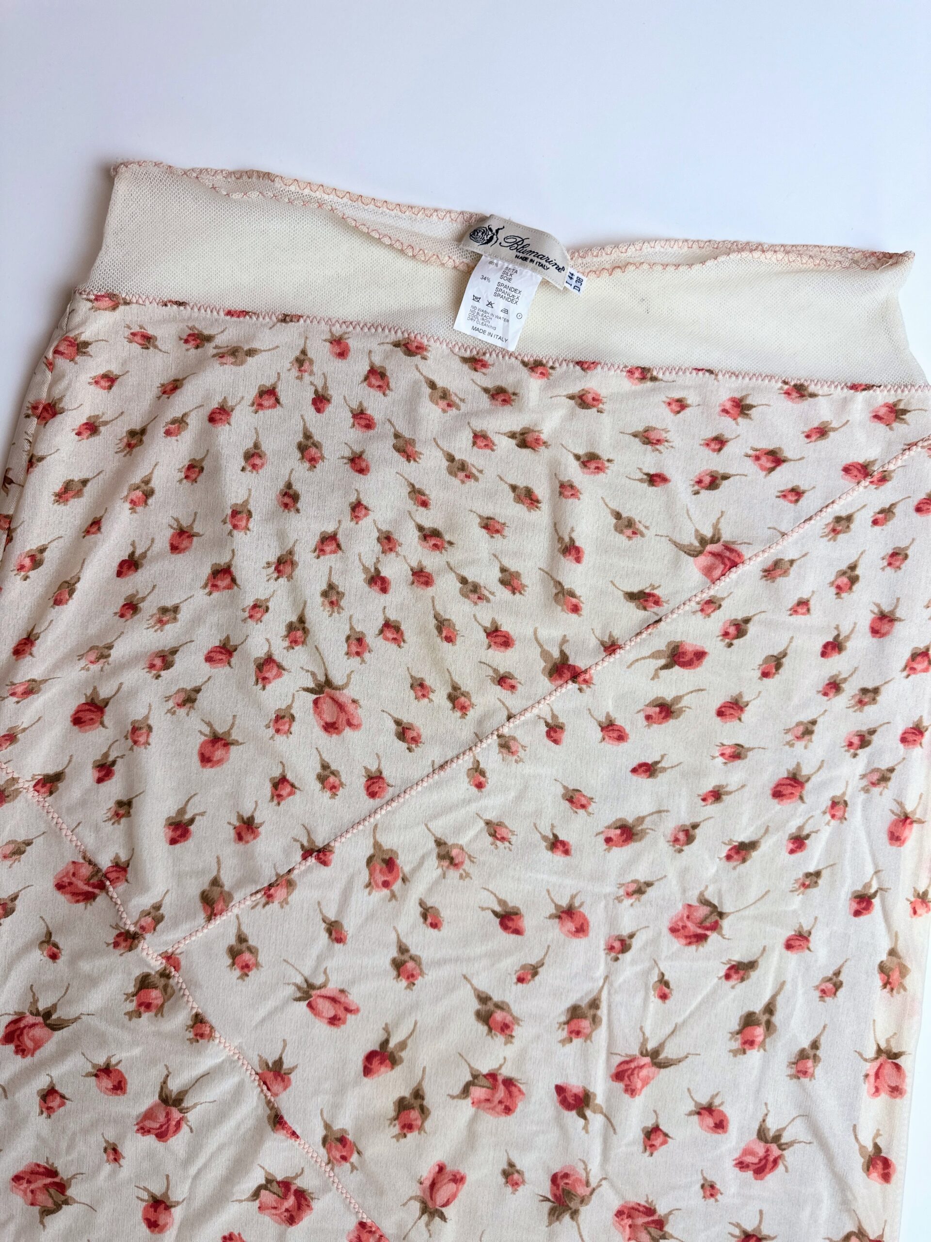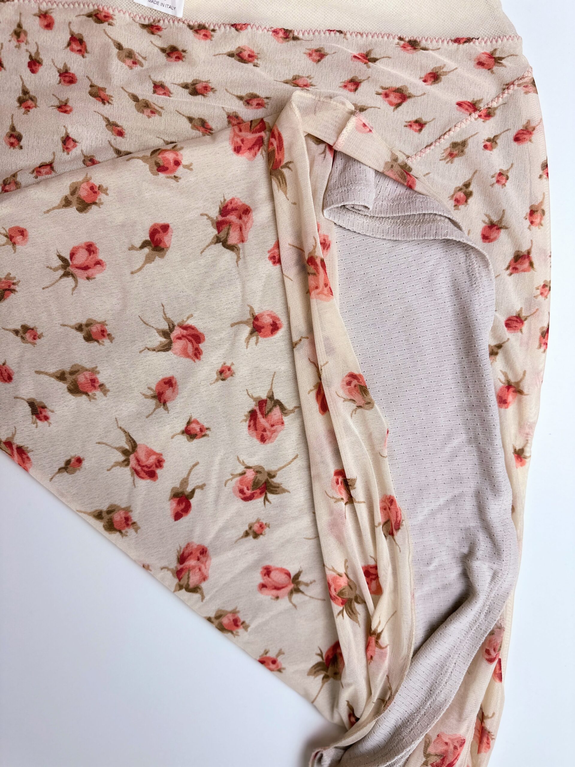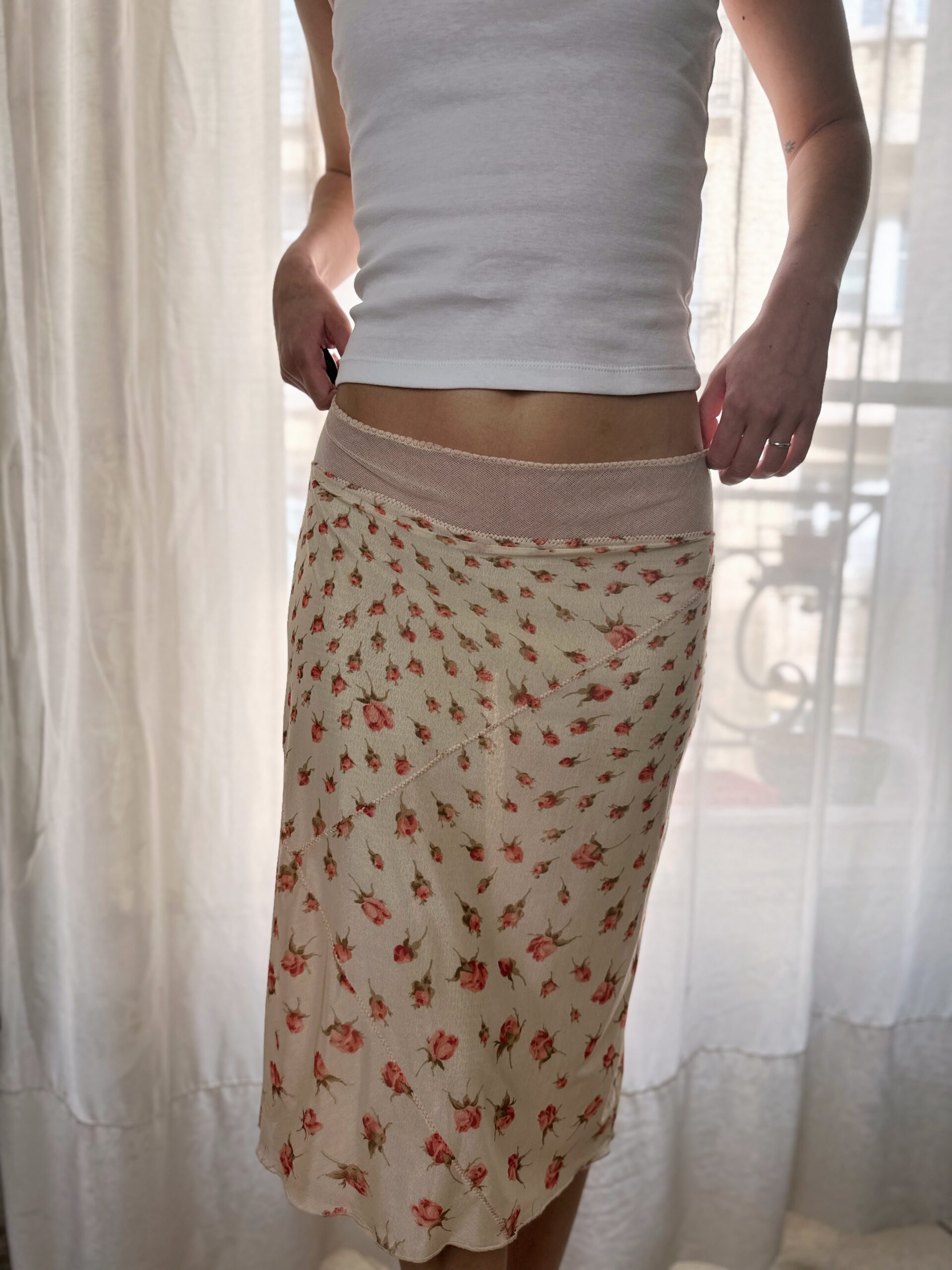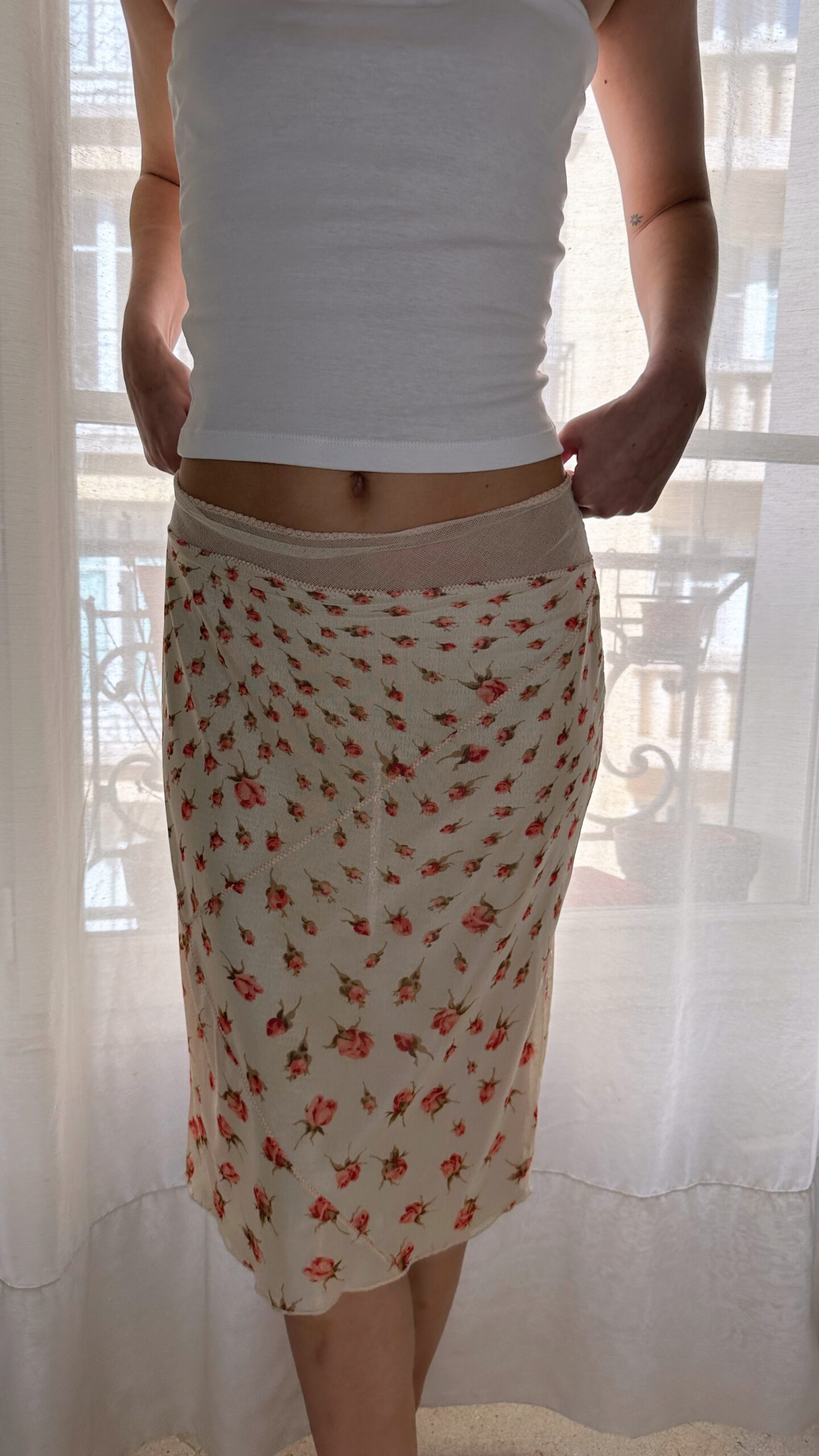 The iconic rose print by the Queen of Roses, Anna Molinari of Blumarine, a true collector’s piece. Slinky smooth fabric, sexy sheer mesh waistband, and flattering midi length. Spring/Summer 2000.