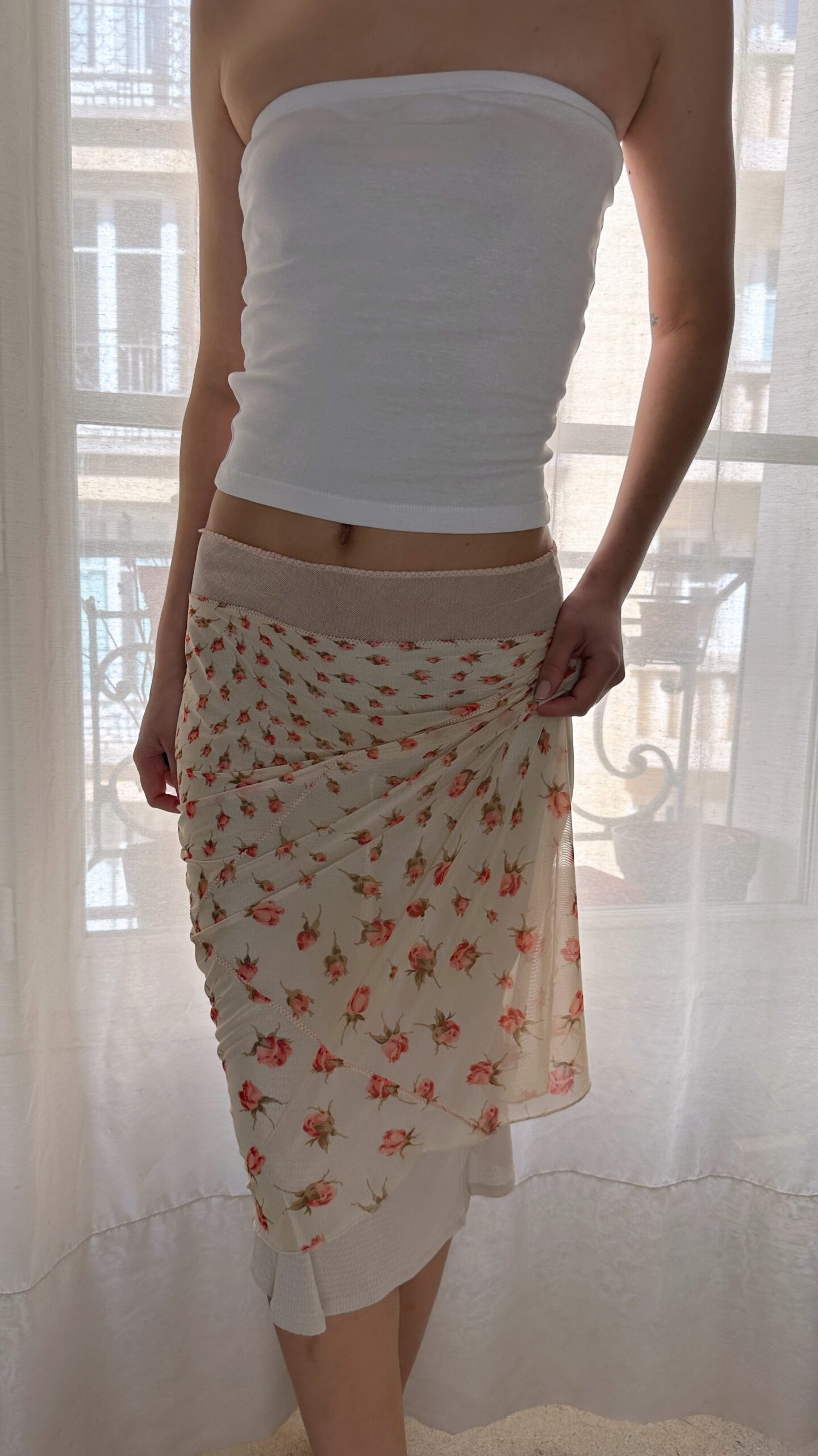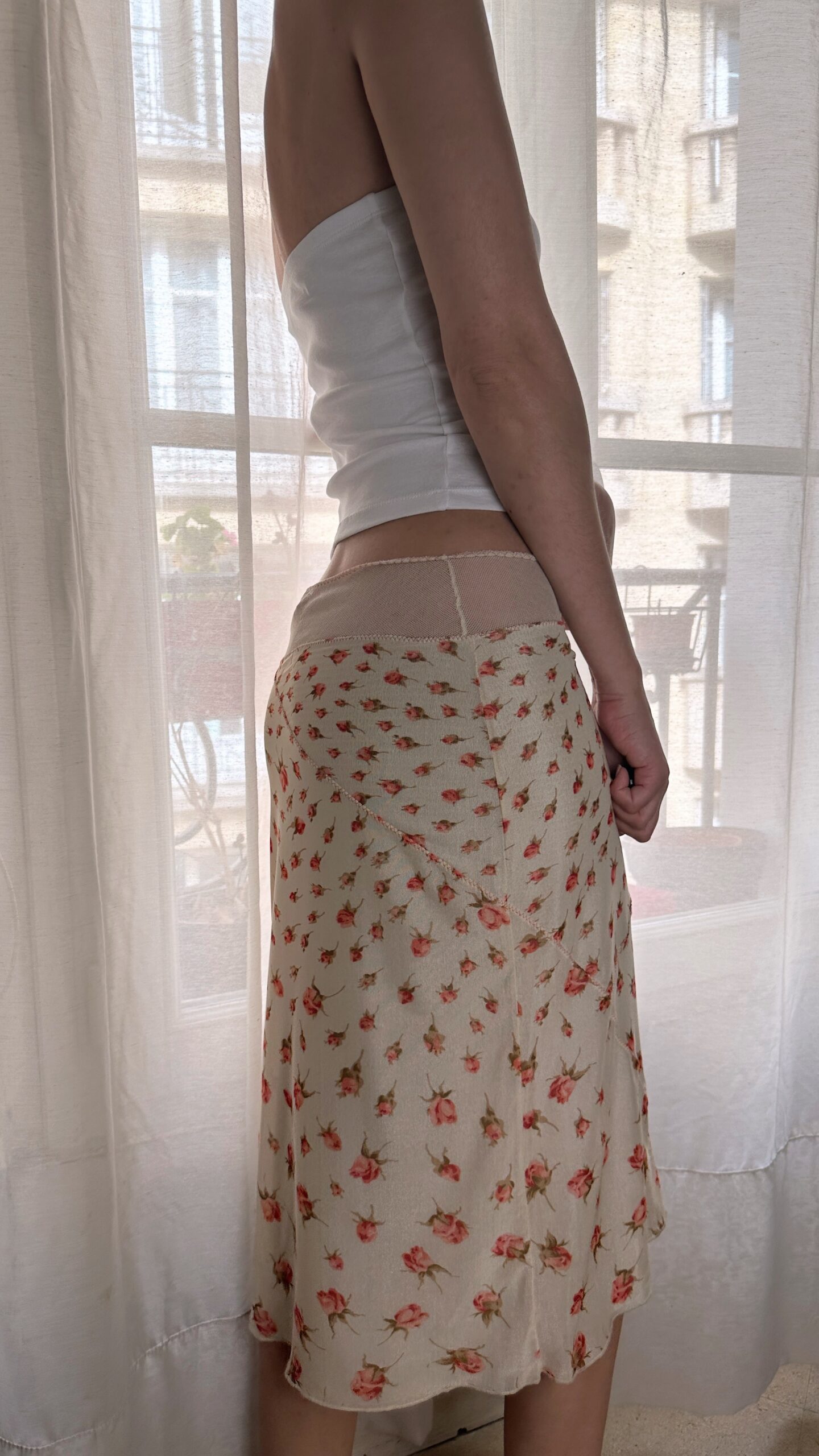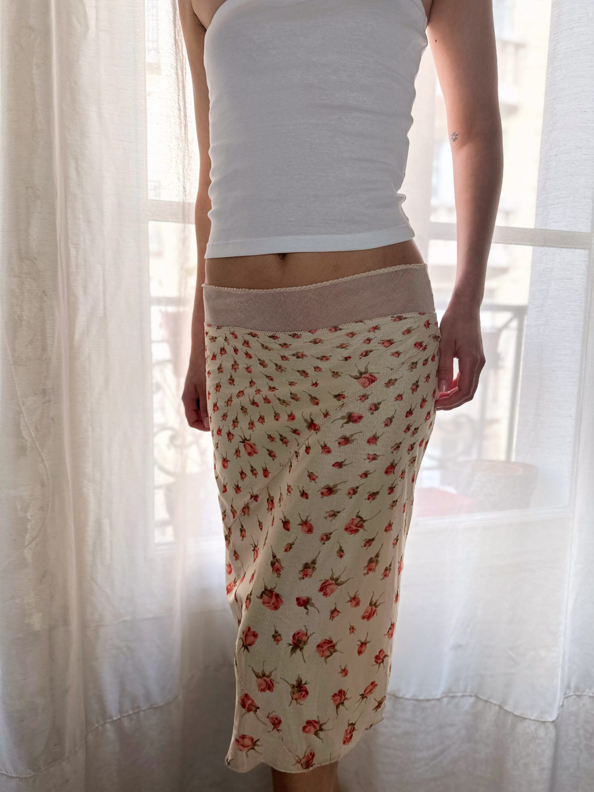 The iconic rose print by the Queen of Roses, Anna Molinari of Blumarine, a true collector’s piece. Slinky smooth fabric, sexy sheer mesh waistband, and flattering midi length. Spring/Summer 2000.
