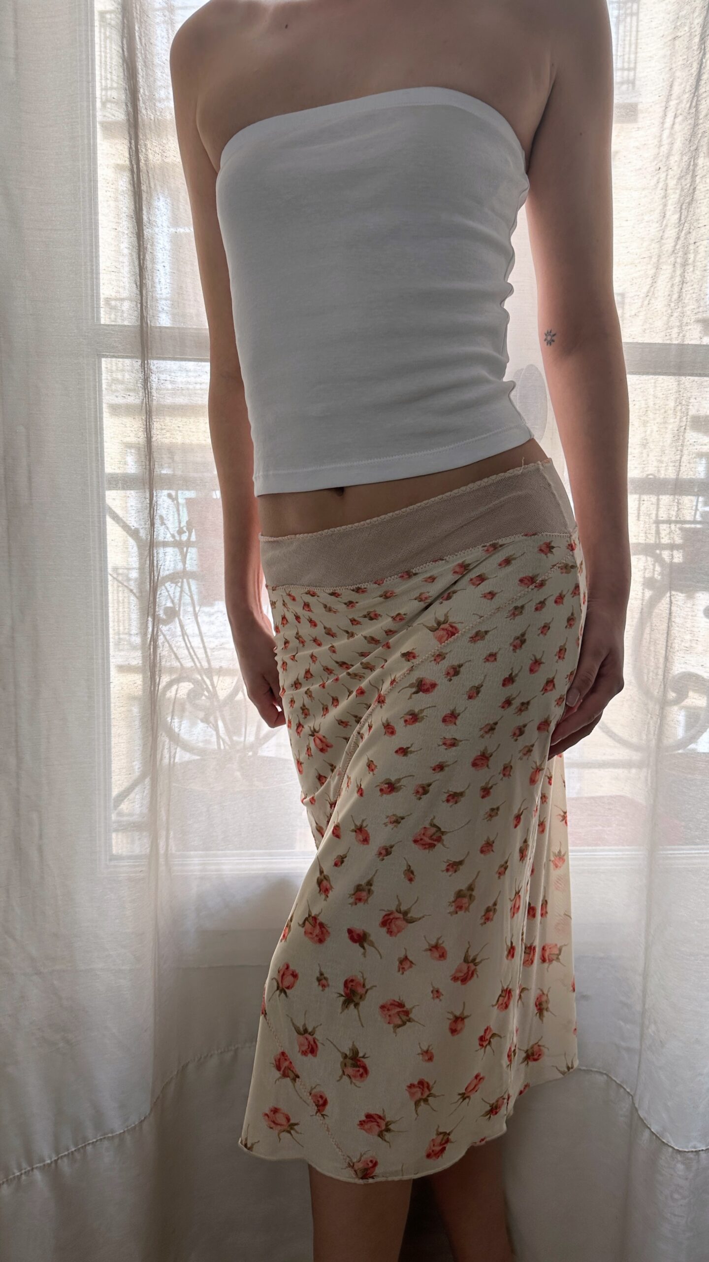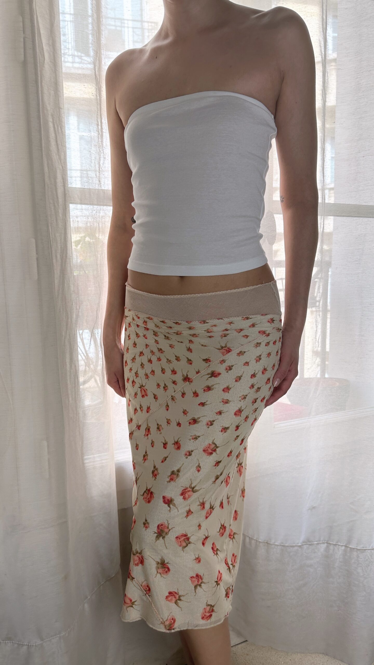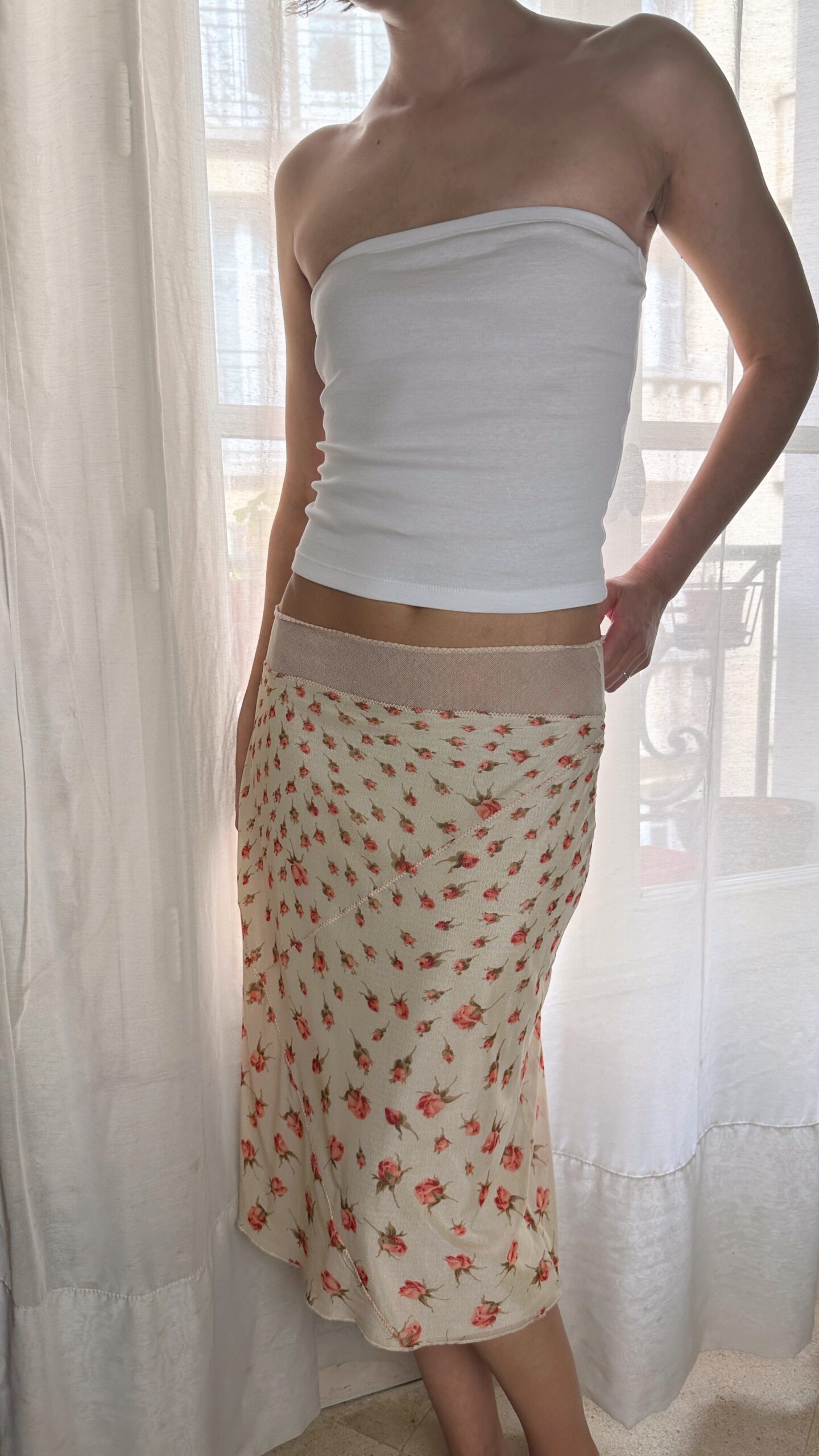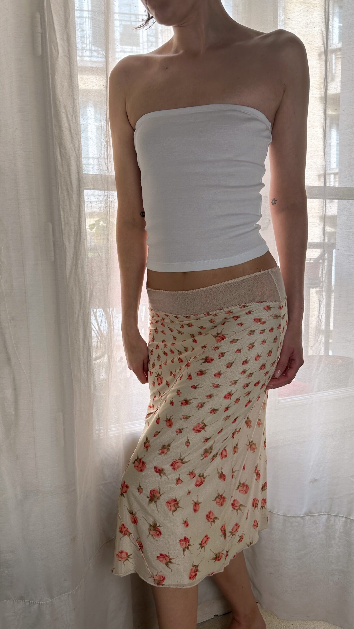 The iconic rose print by the Queen of Roses, Anna Molinari of Blumarine, a true collector’s piece. Slinky smooth fabric, sexy sheer mesh waistband, and flattering midi length. Spring/Summer 2000.