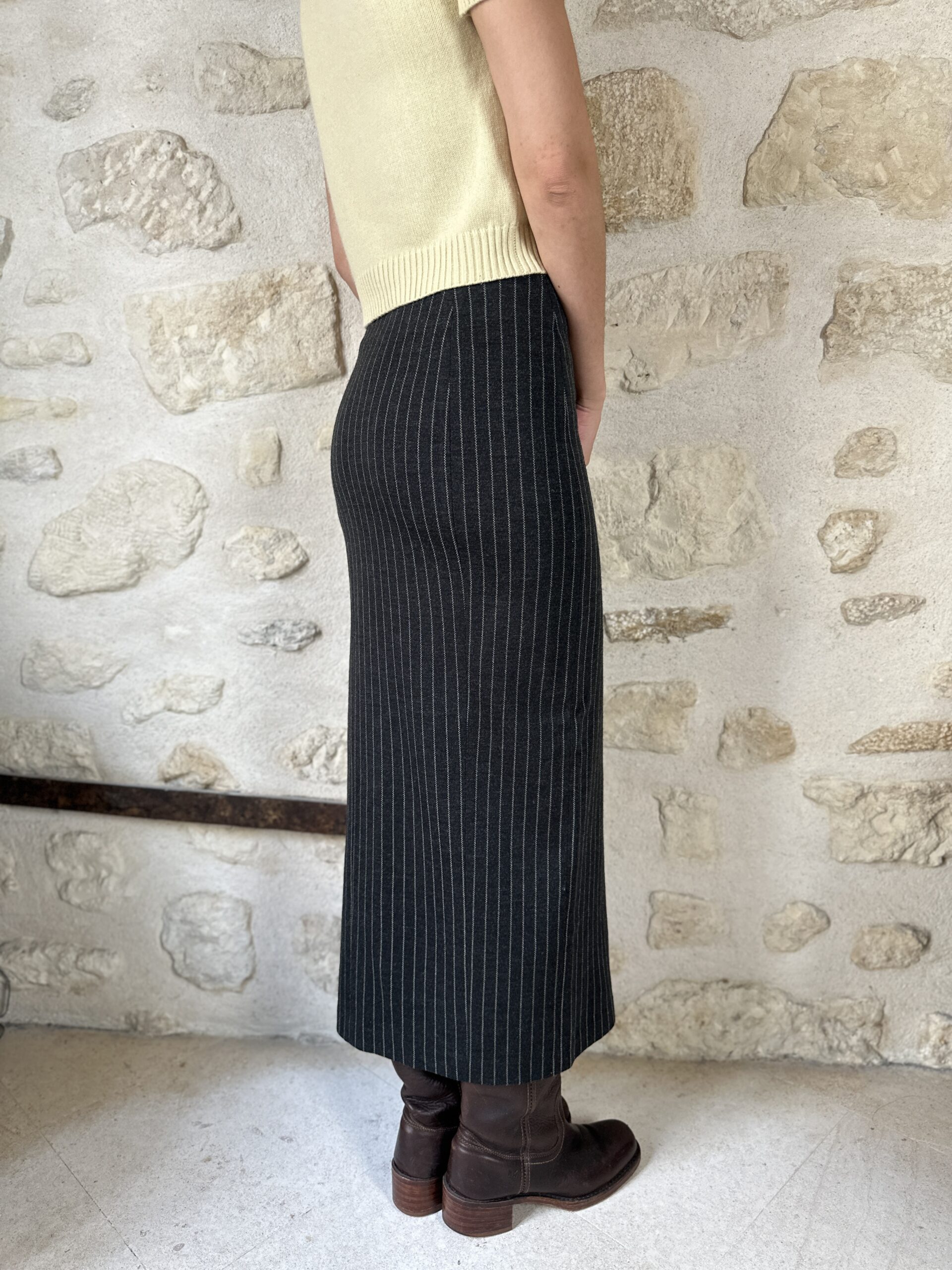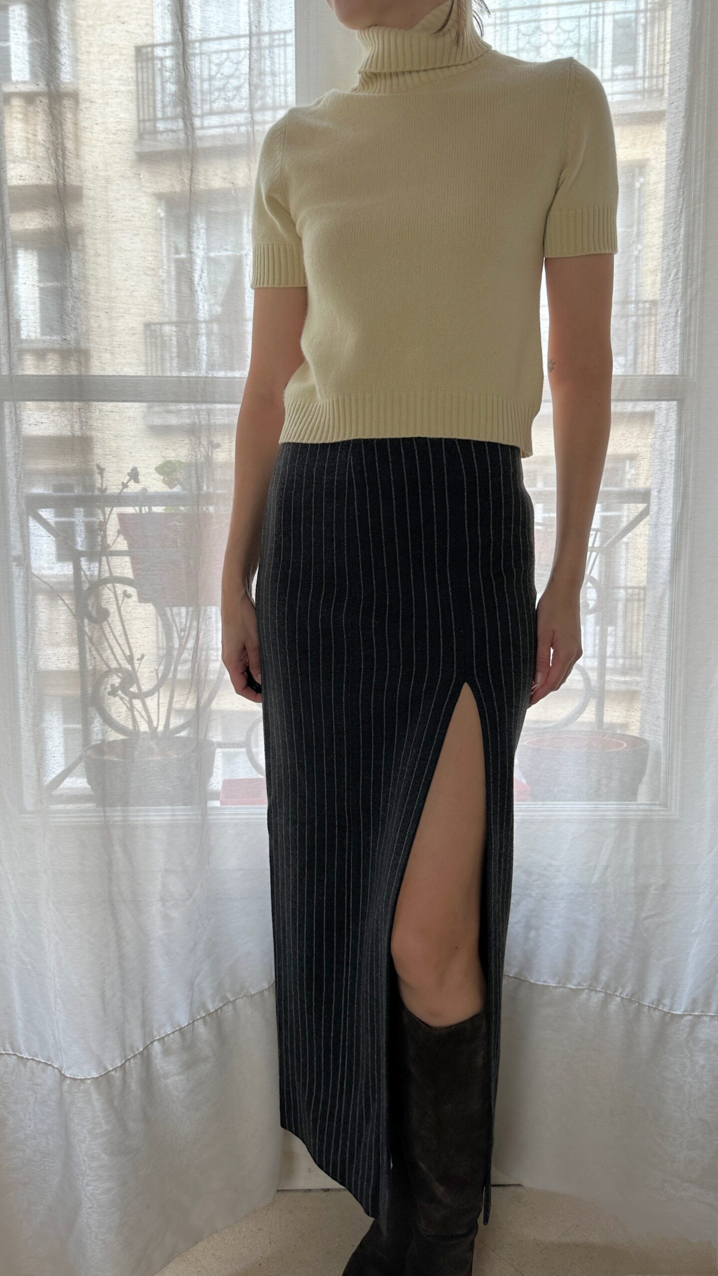 Vintage 90’s Capucine Puerari slit skirt with pinstripe pattern and soft wool.