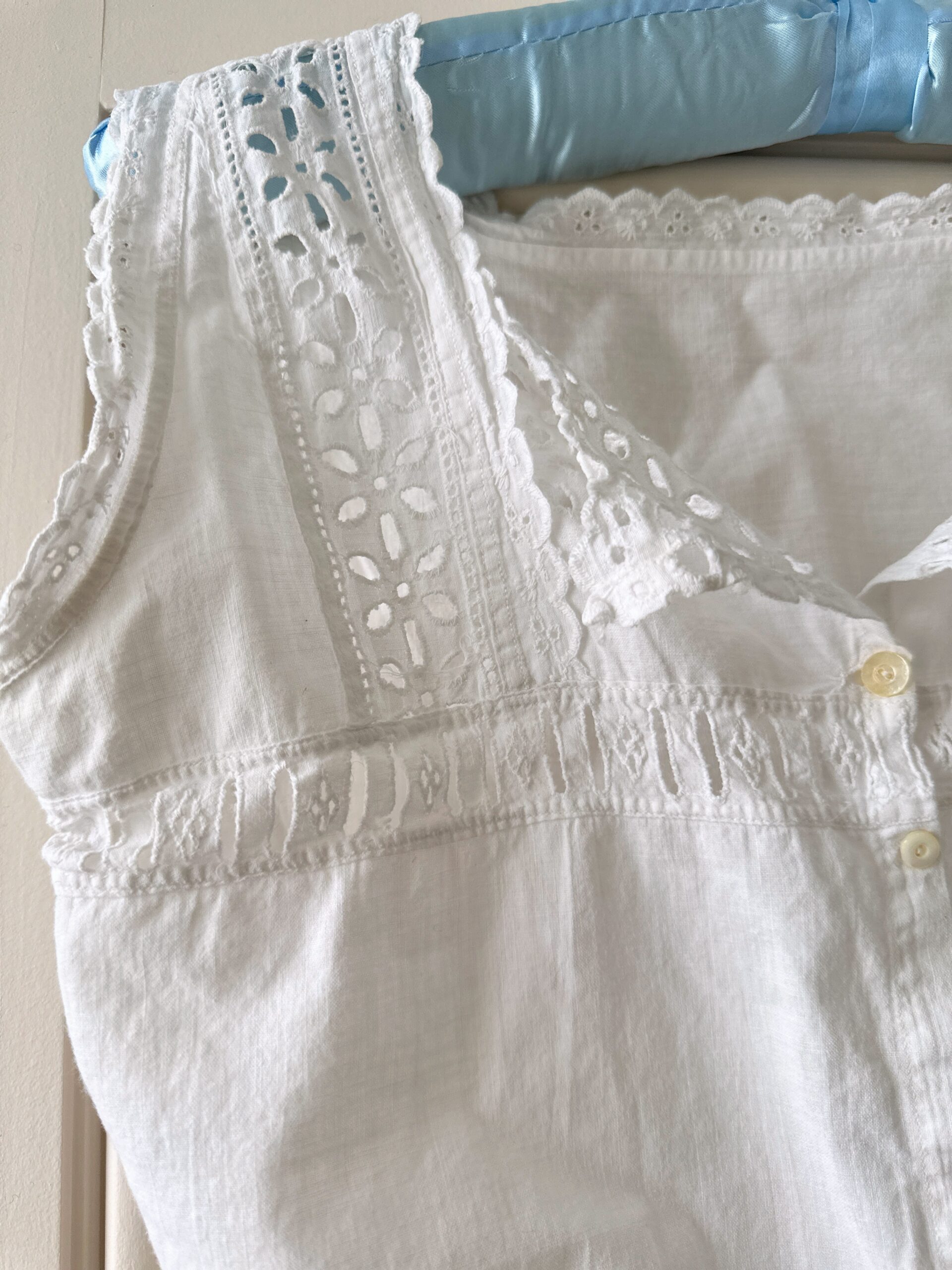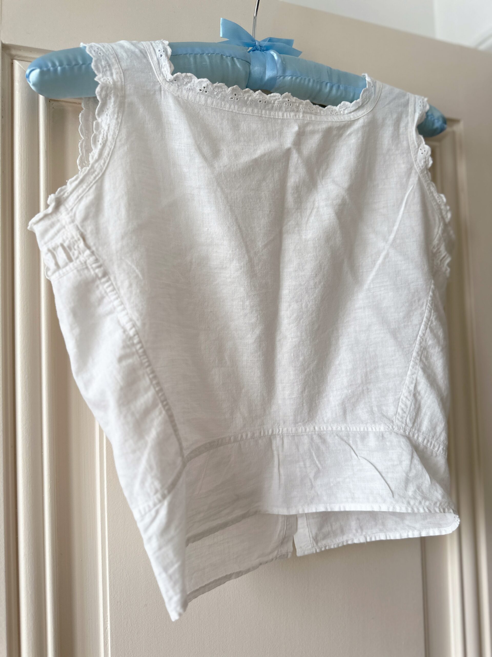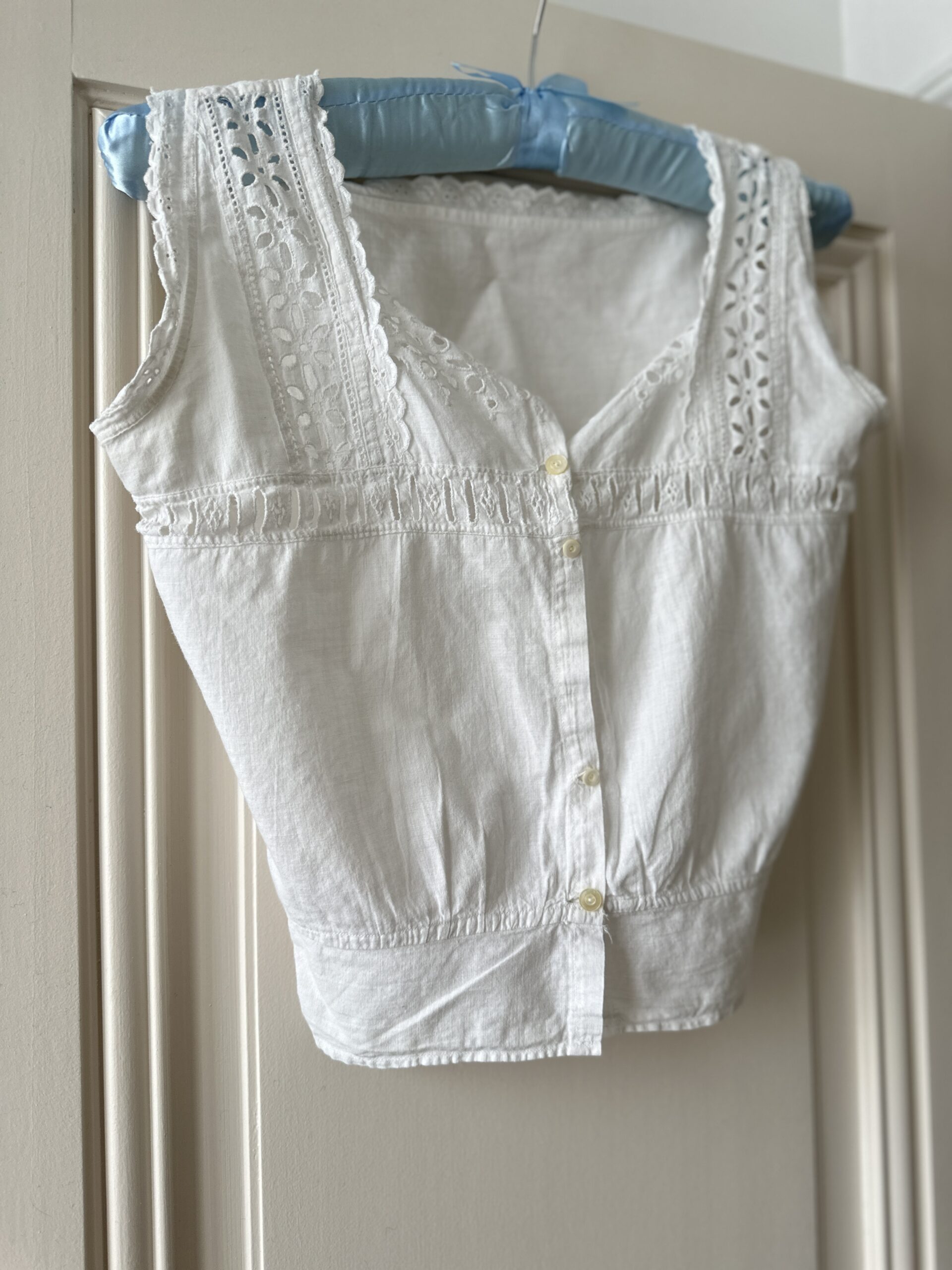 White cotton cropped corset cover with eyelet lace trim, simple and versatile. Features front ribbon slots at the bust for optional lacing.