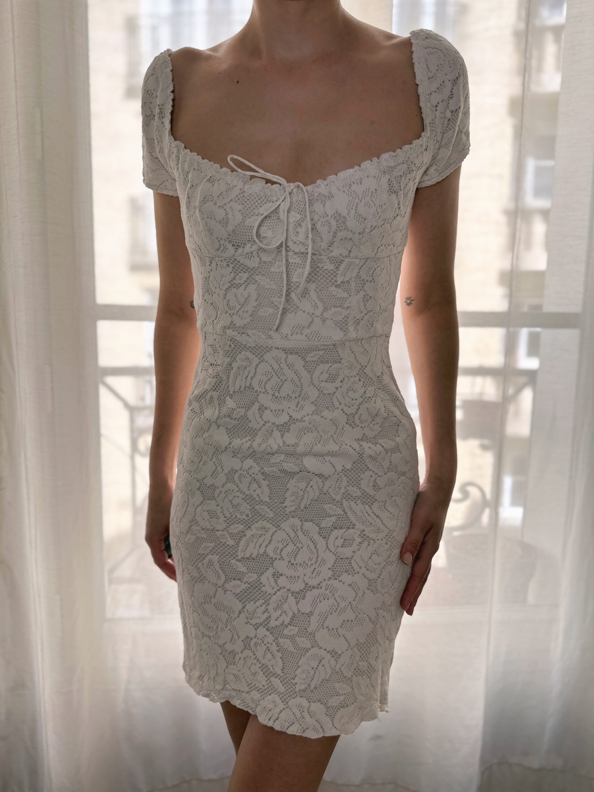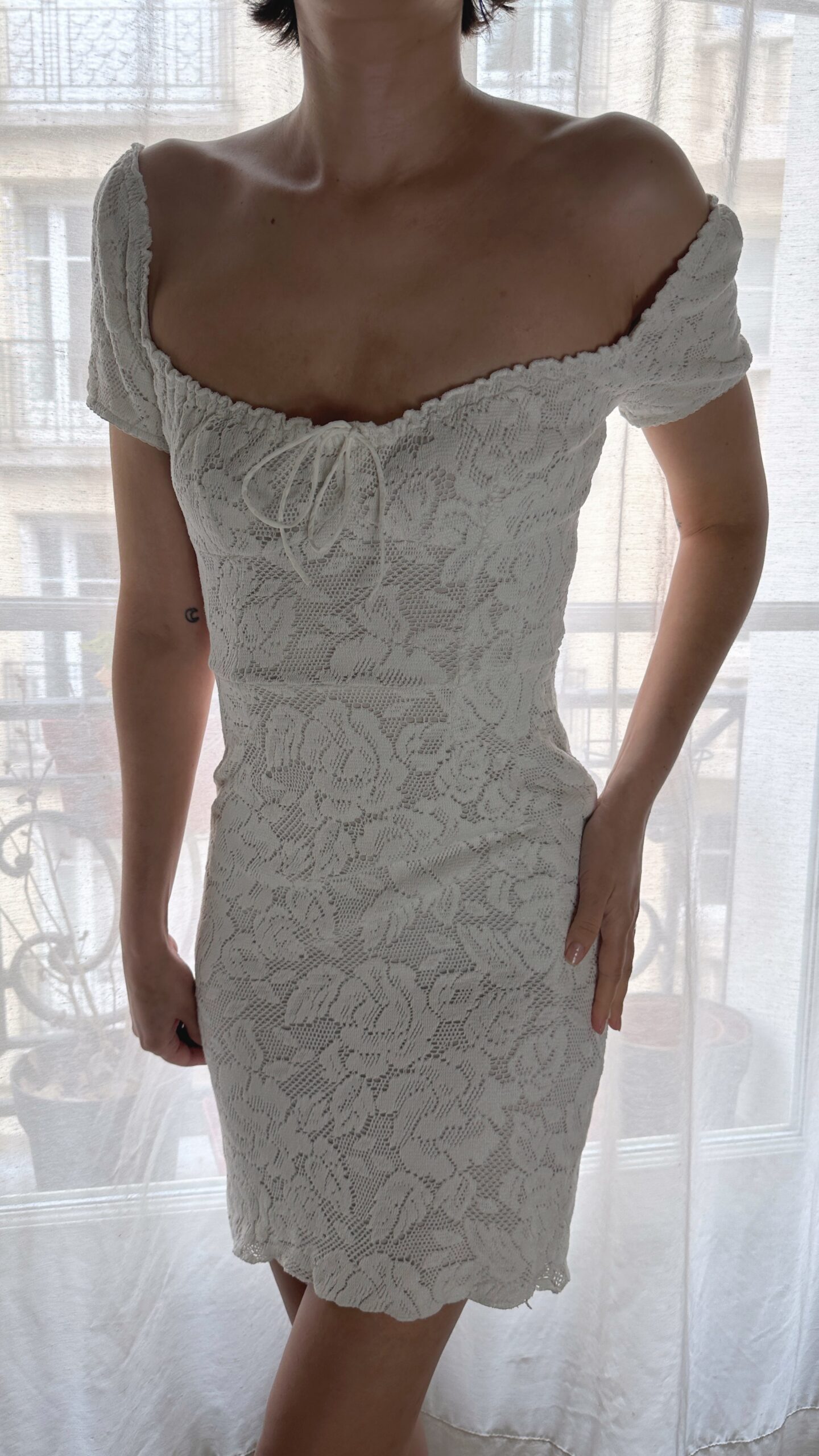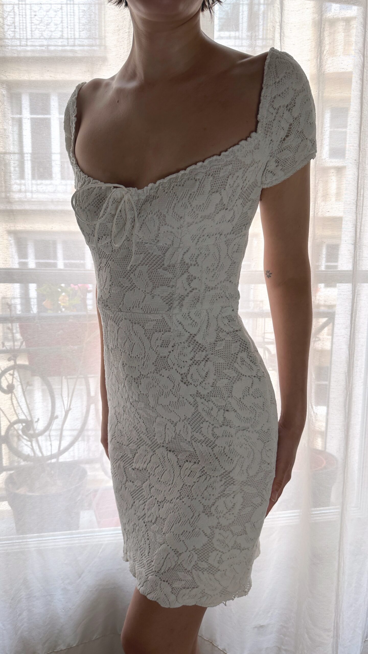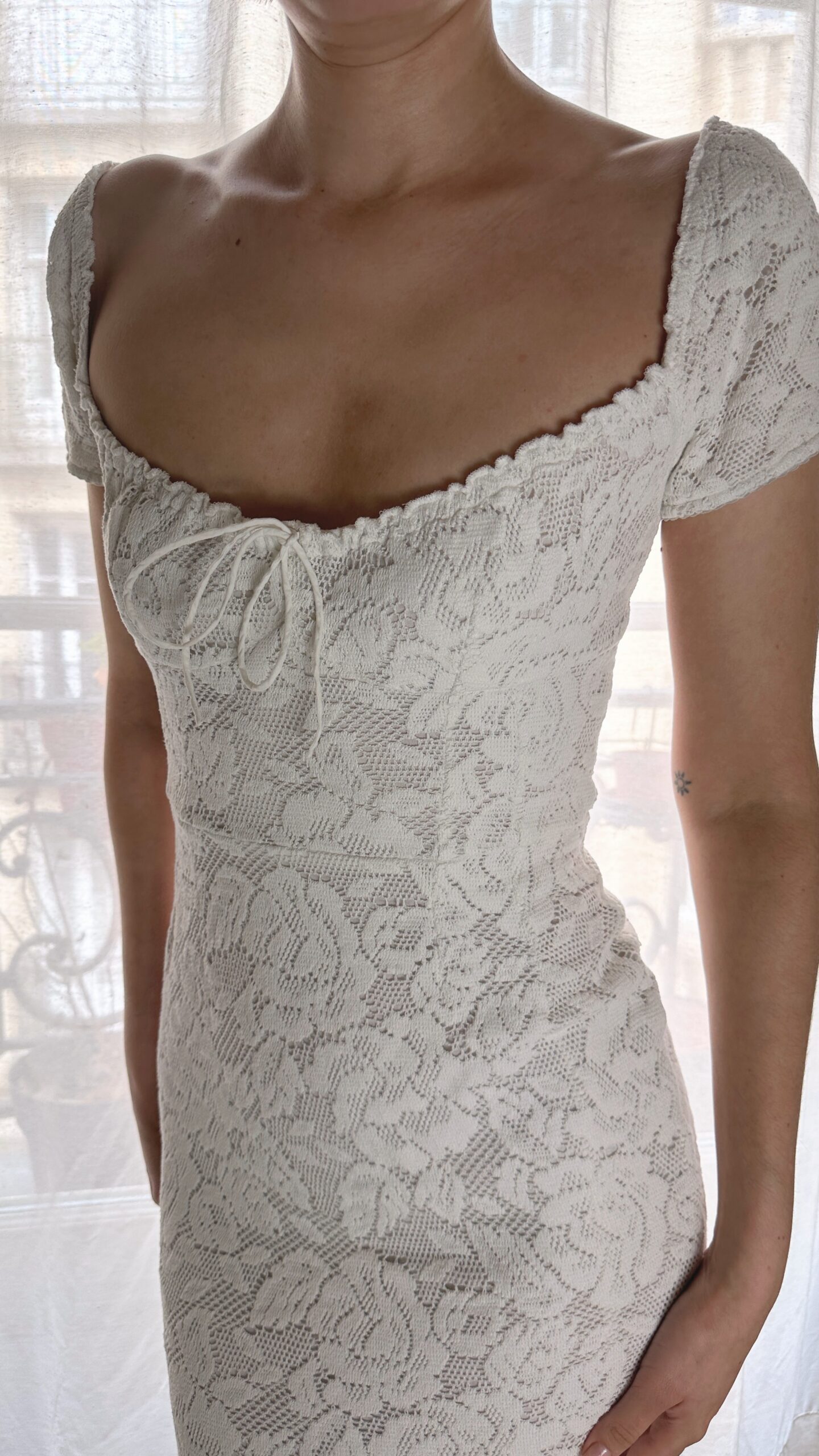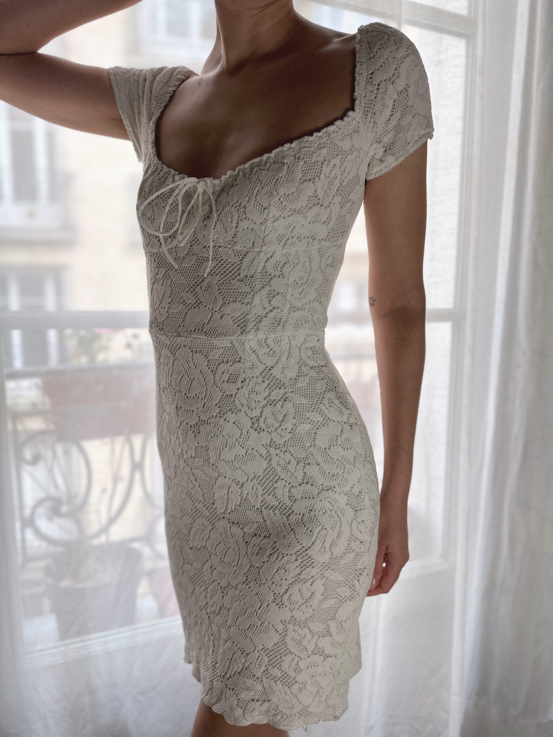 Gorgeously soft crochet milkmaid dress from Dolce & Gabbana, featured on their runway collection 2011 Spring Summer. Also seen on Sabrina Carpenter for her promotion of her album Man’s Best Friend in 2025.