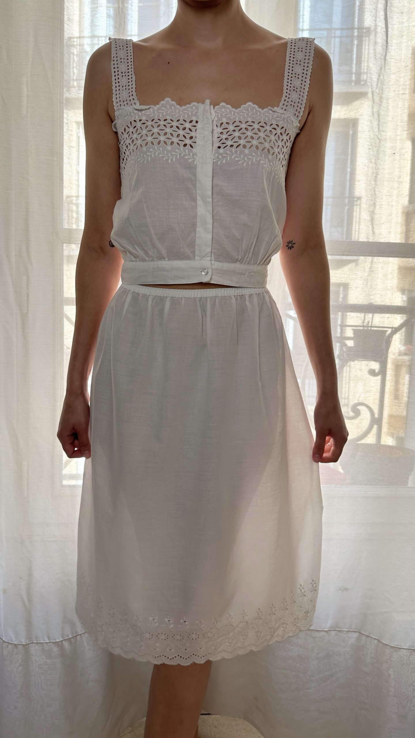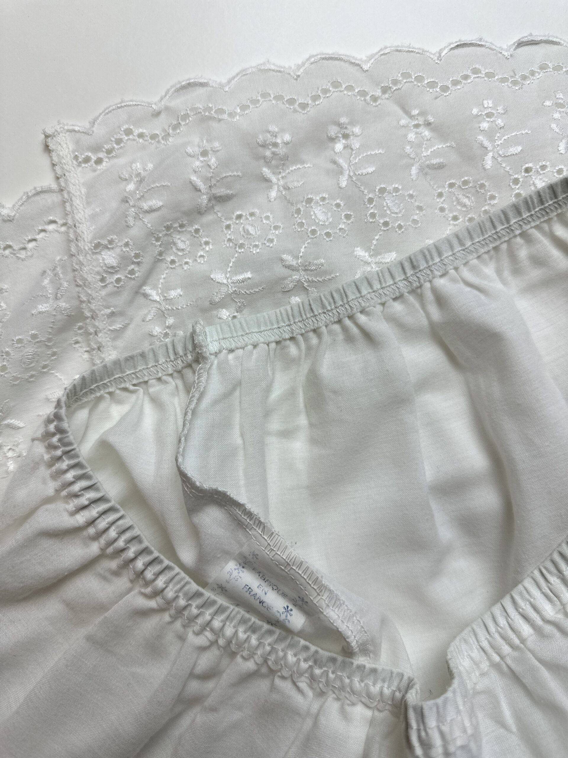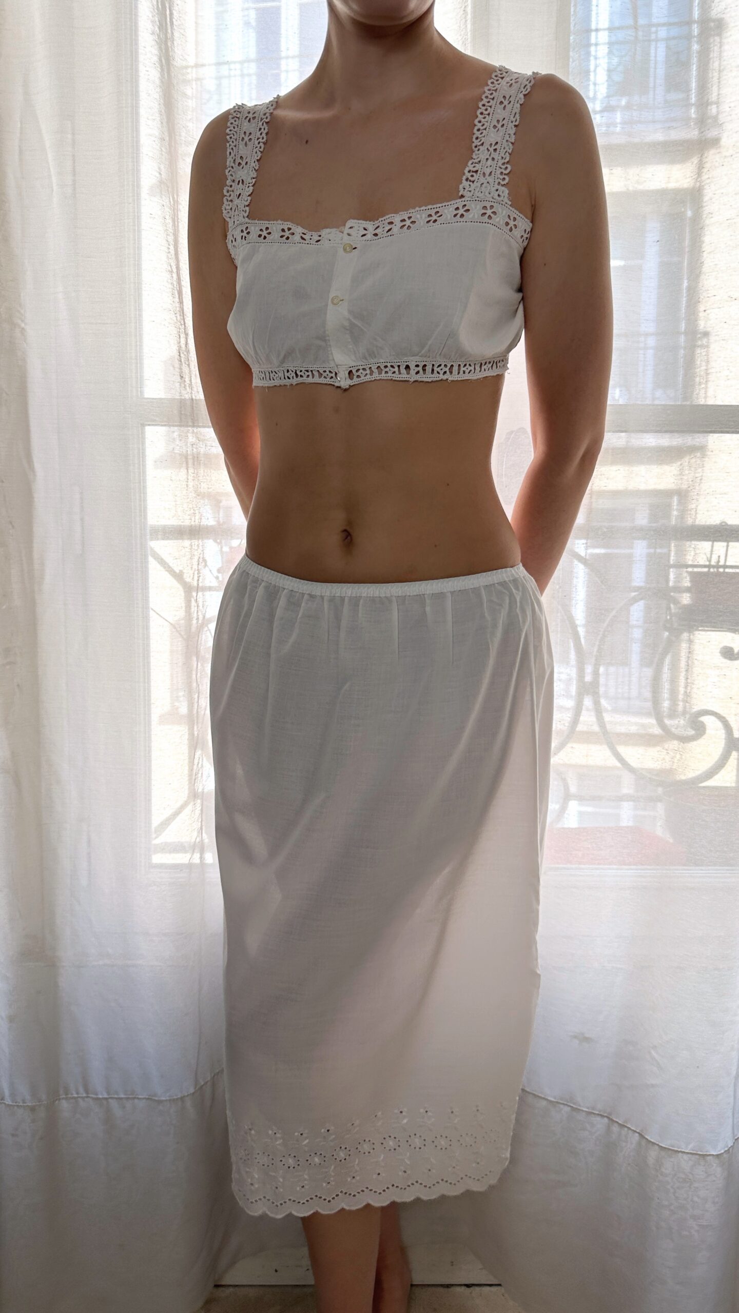 Vintage, made in France cotton petticoat with eyelet lace details.