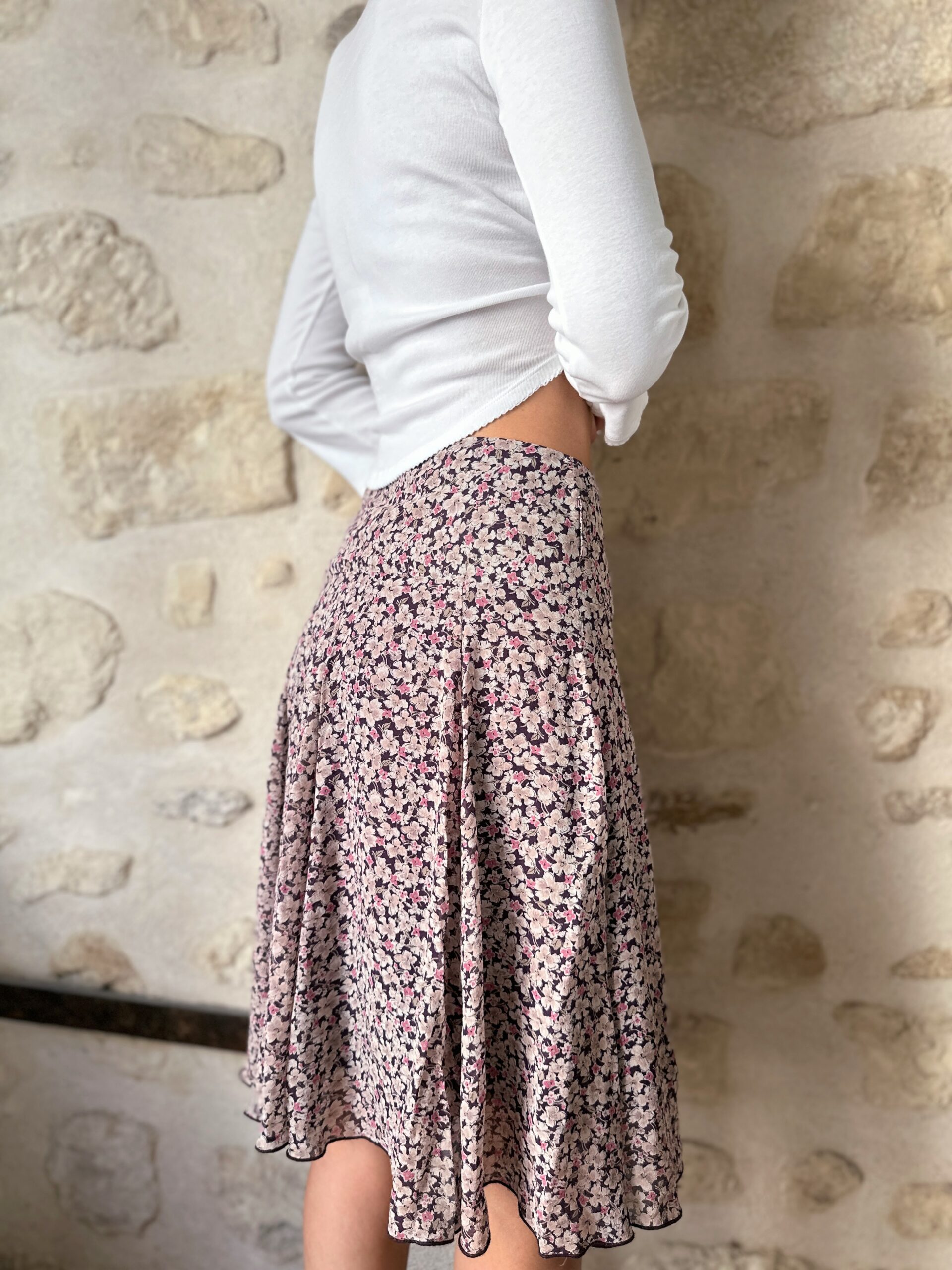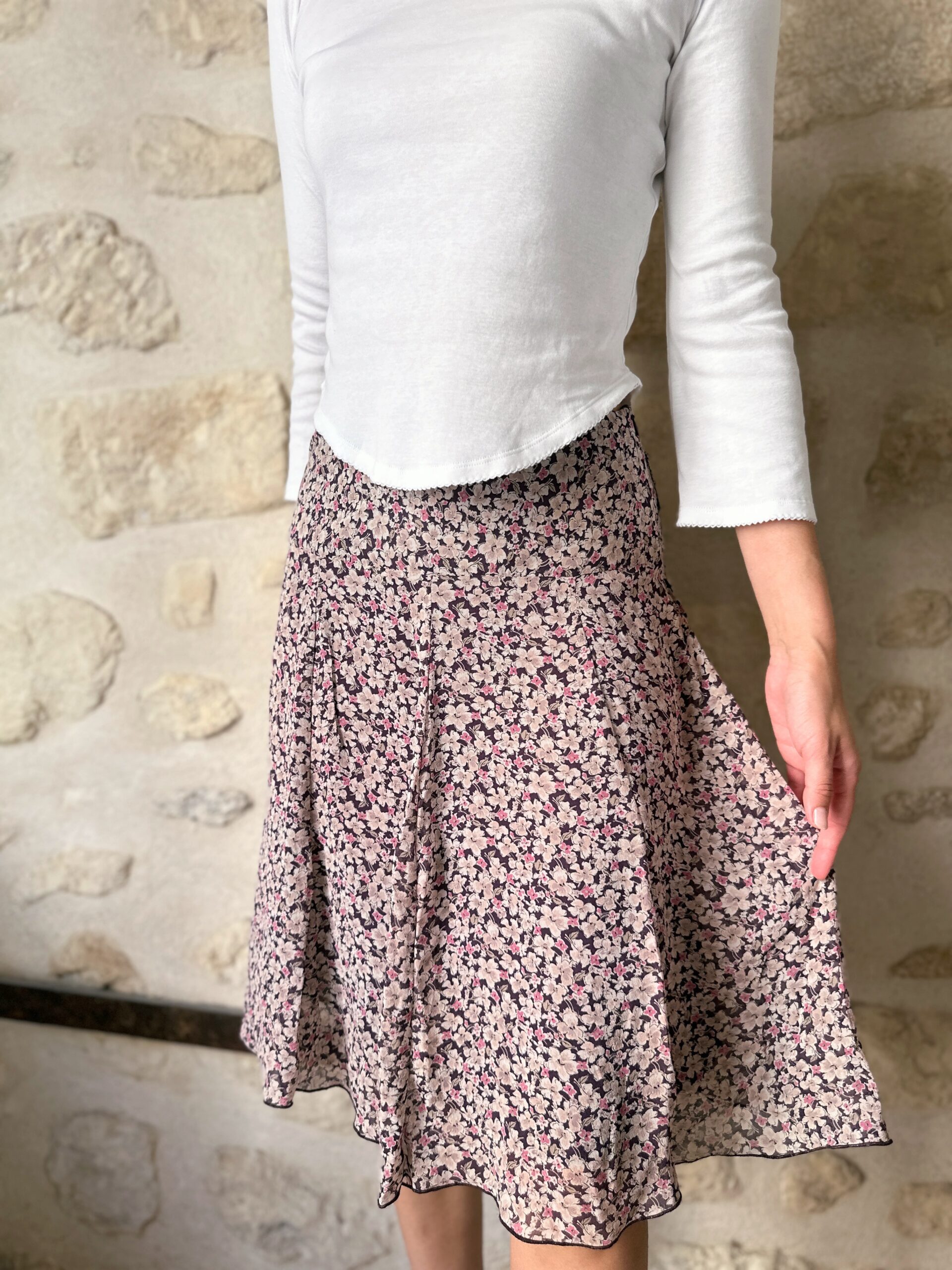 French Floral Silk Midi Skirt