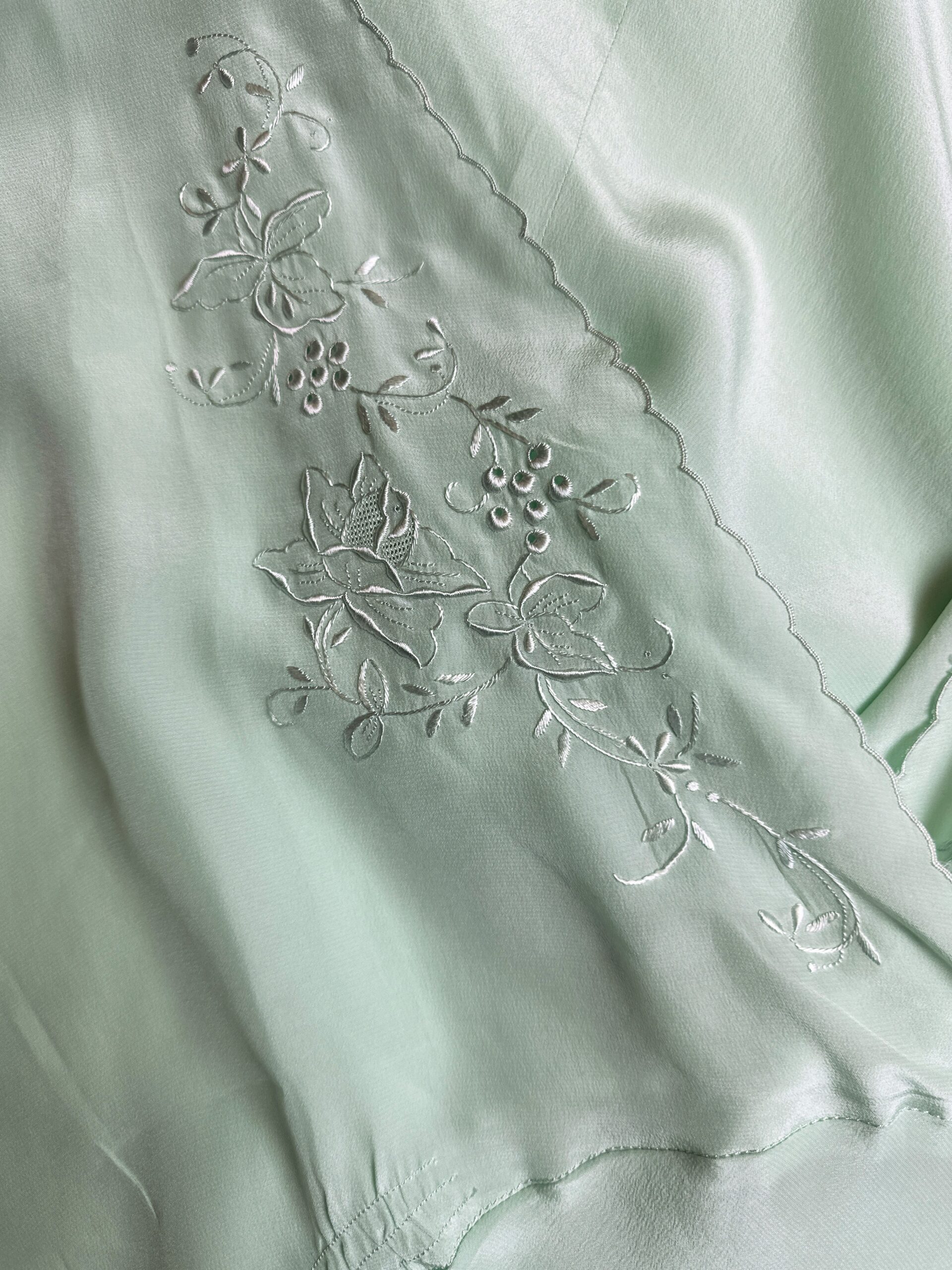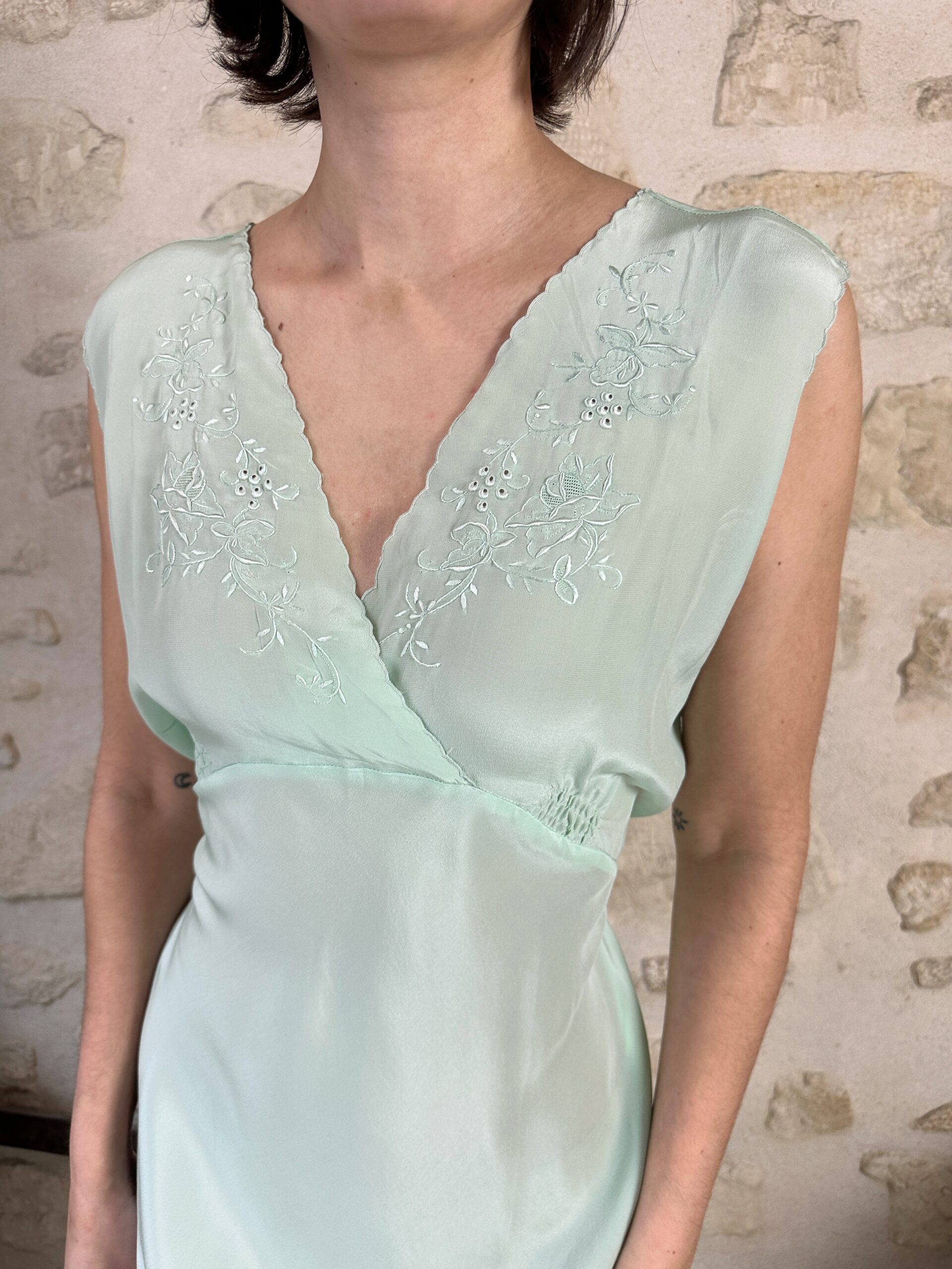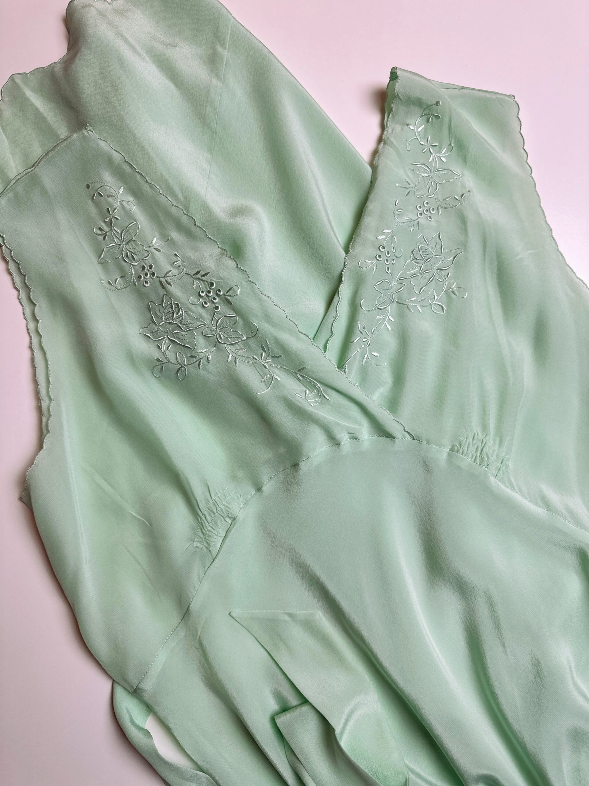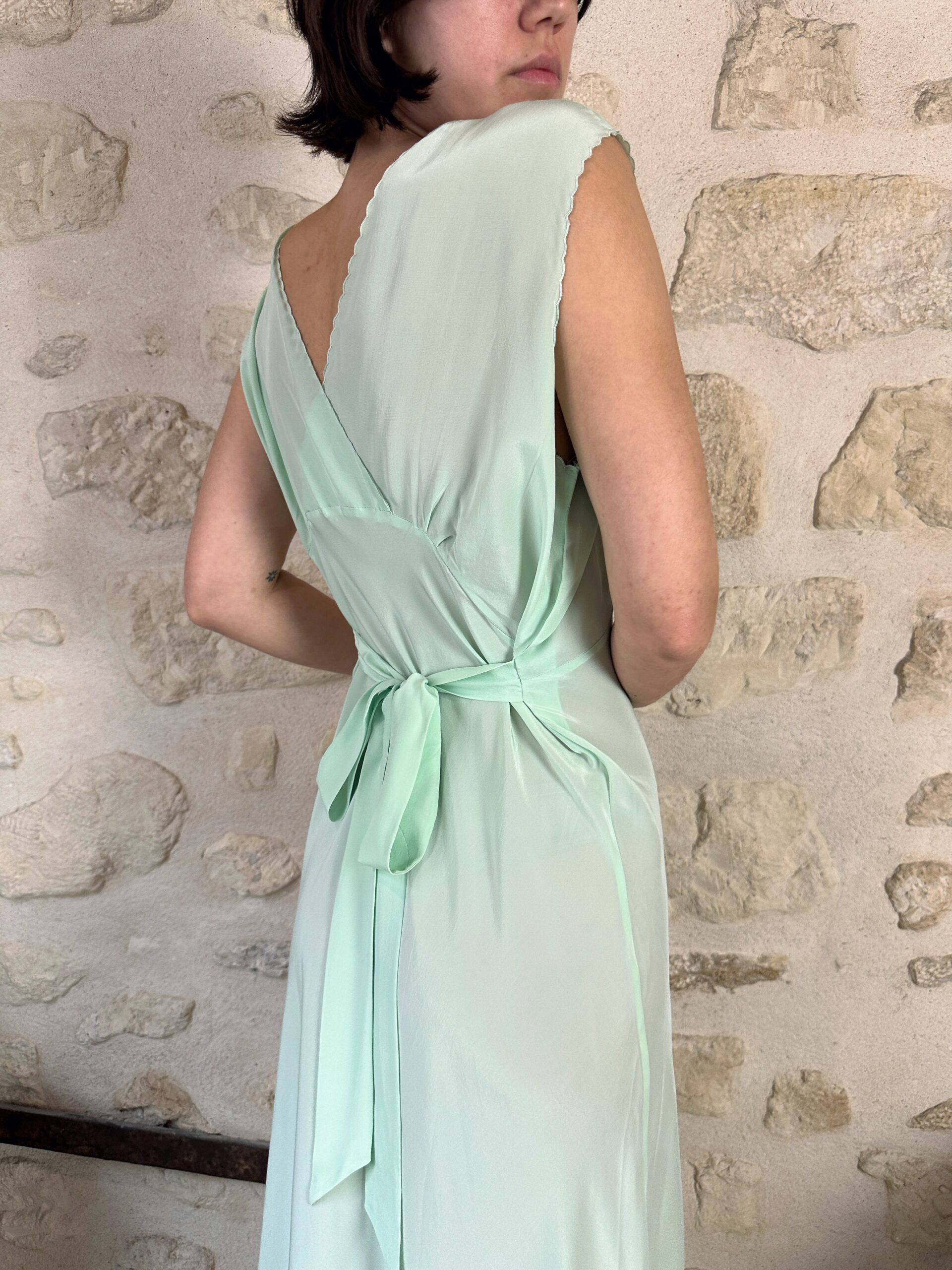 Mint-green pure natural silk vintage gown with sash to adjust the waist. Cut on the bias.