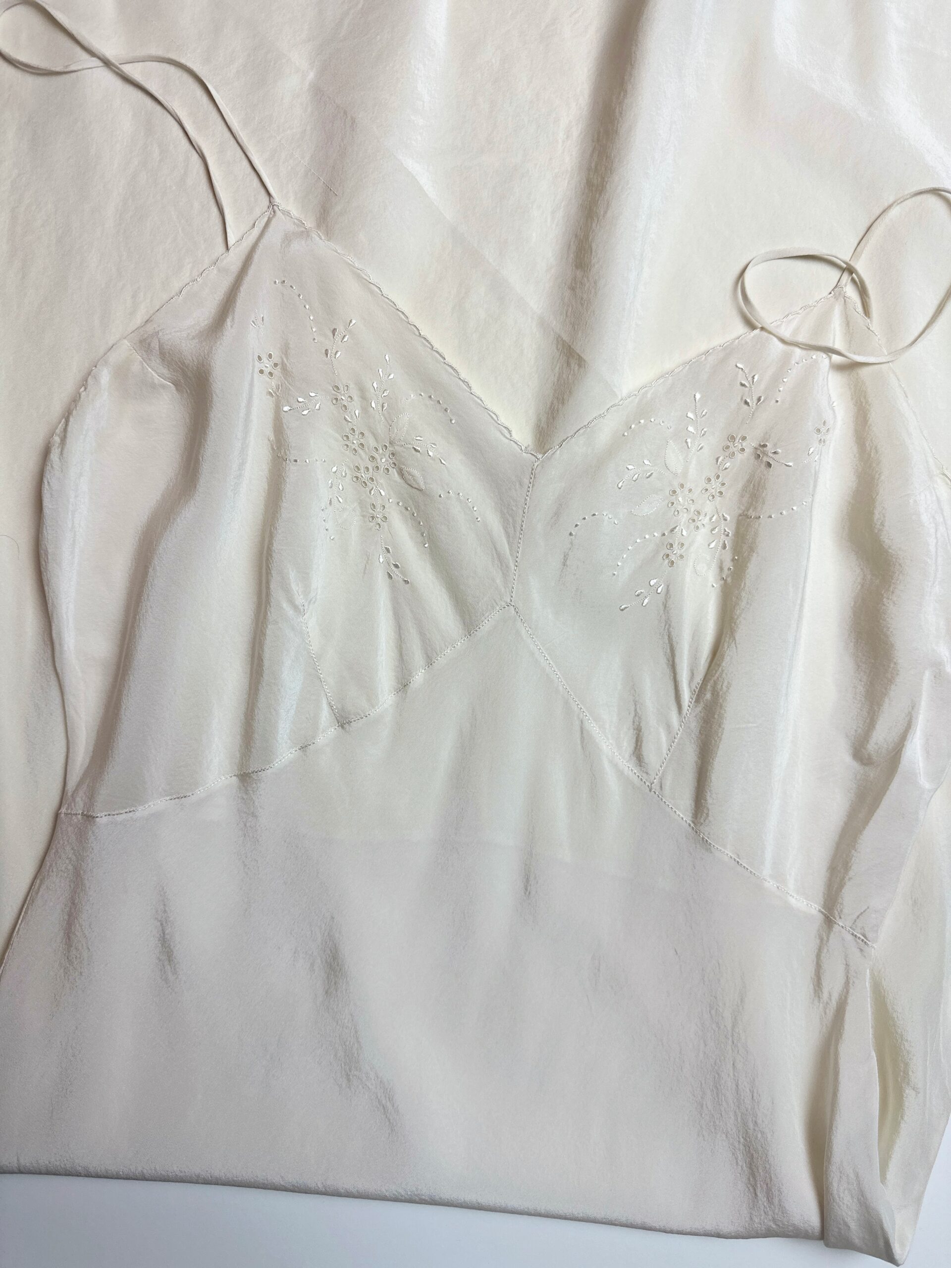 Classic silk slip dress sourced in Rome, with subtle embroidered details on the bust.