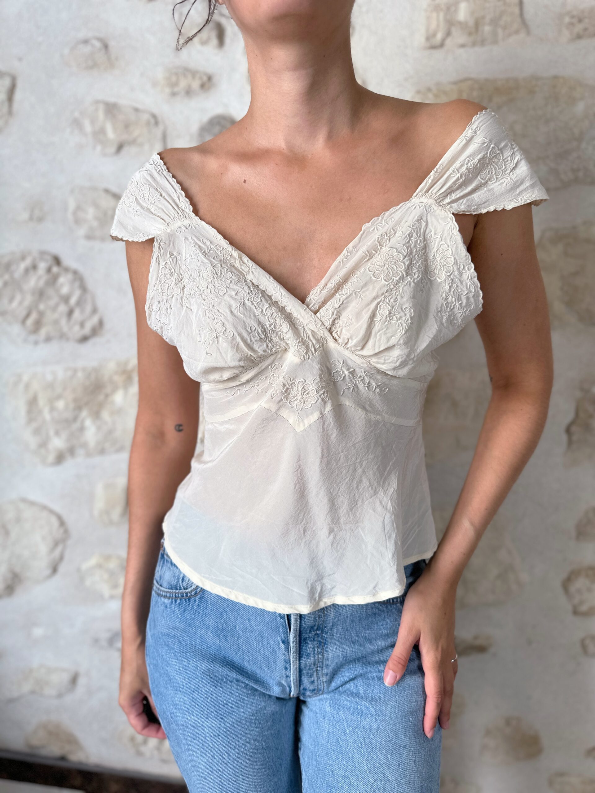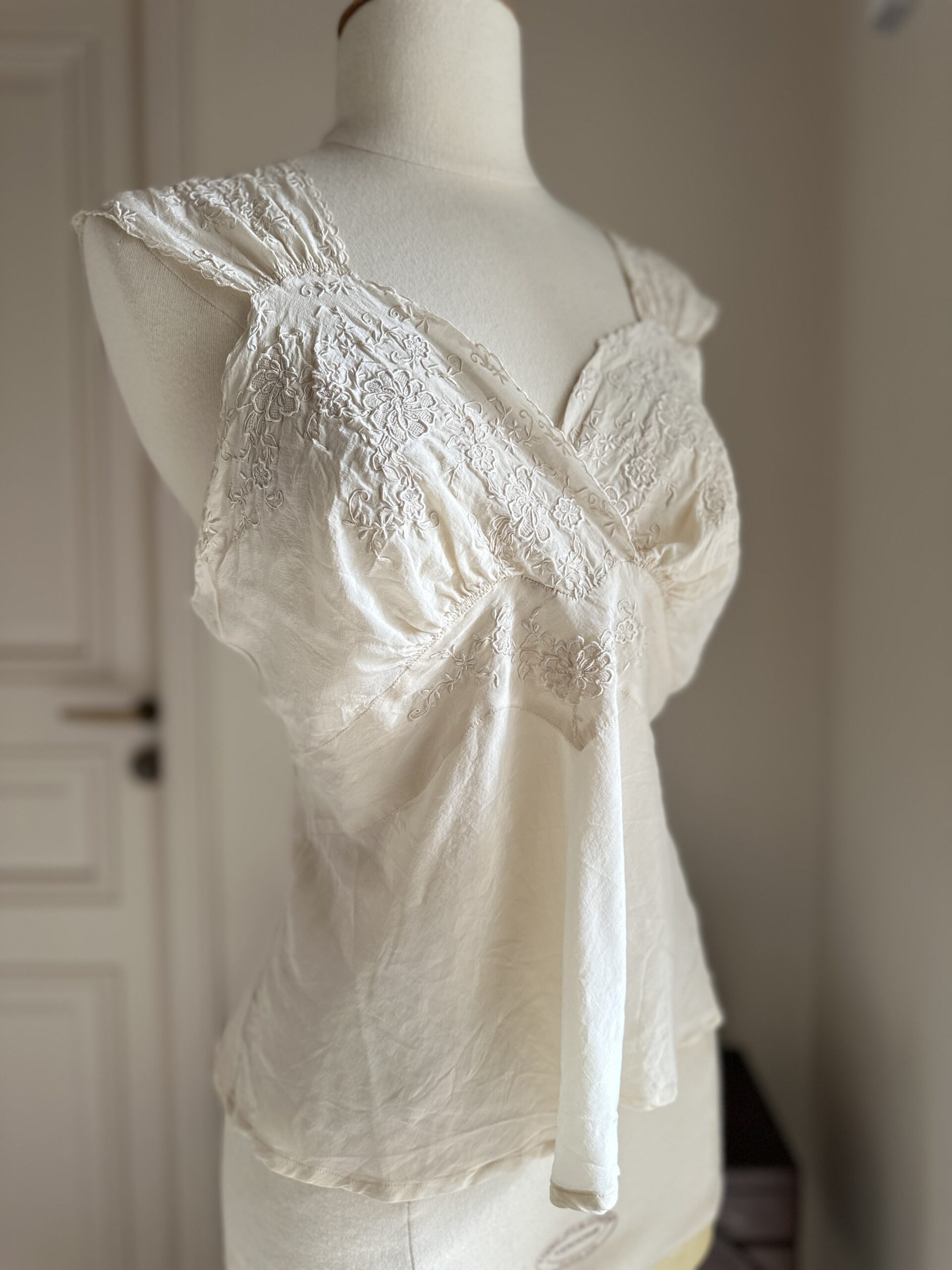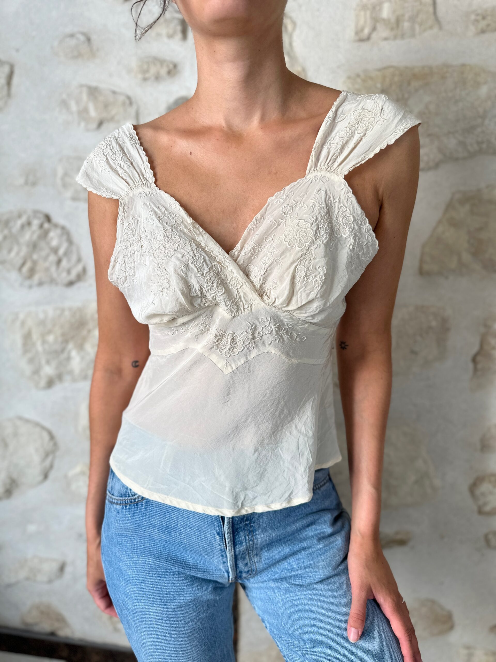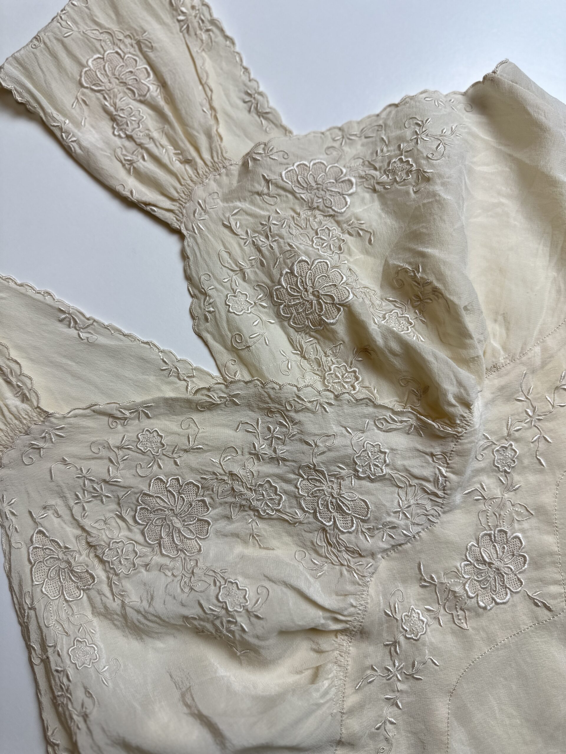 Flowing silk top featuring scalloped sleeve edges and fine embroidery.