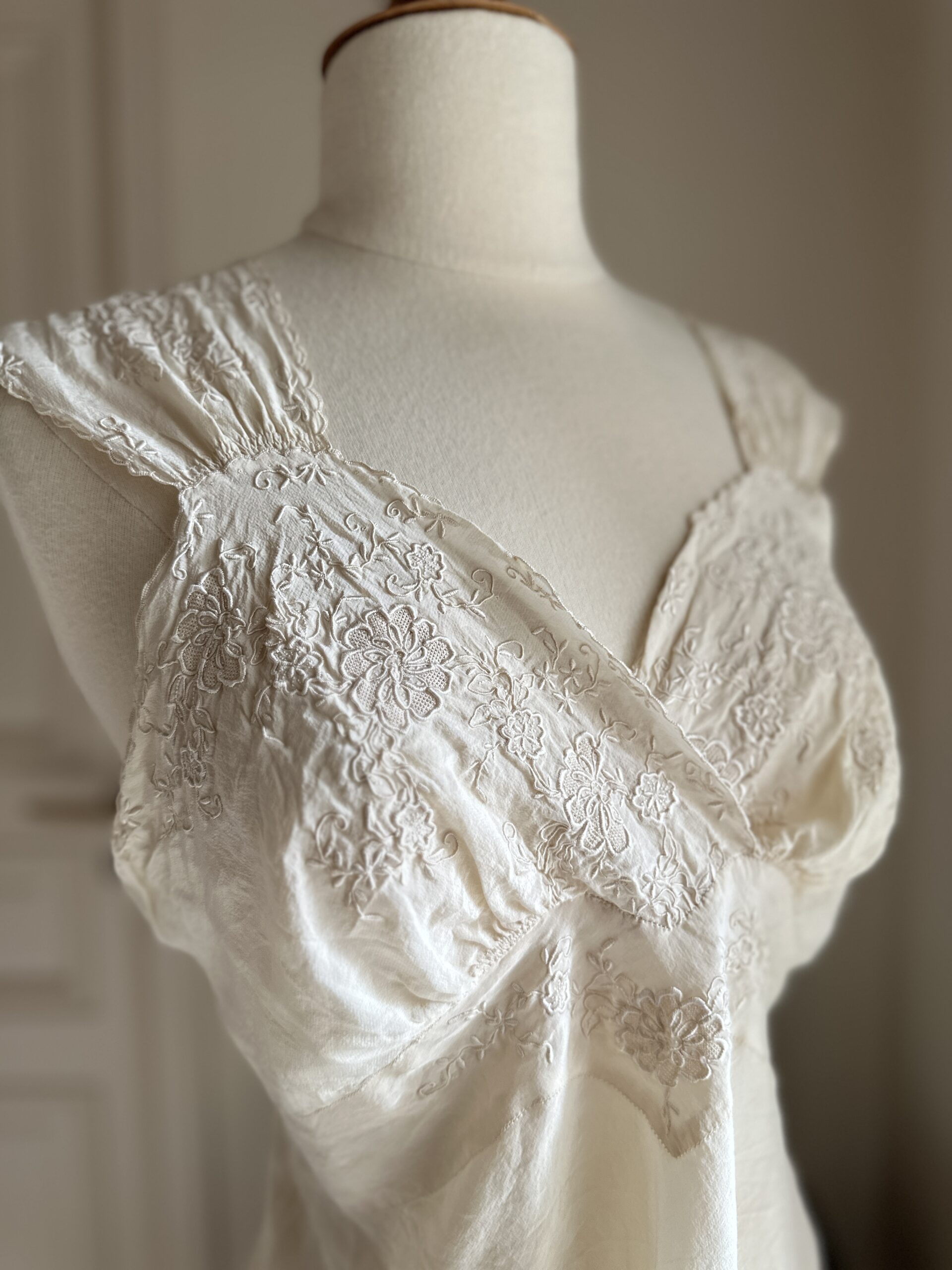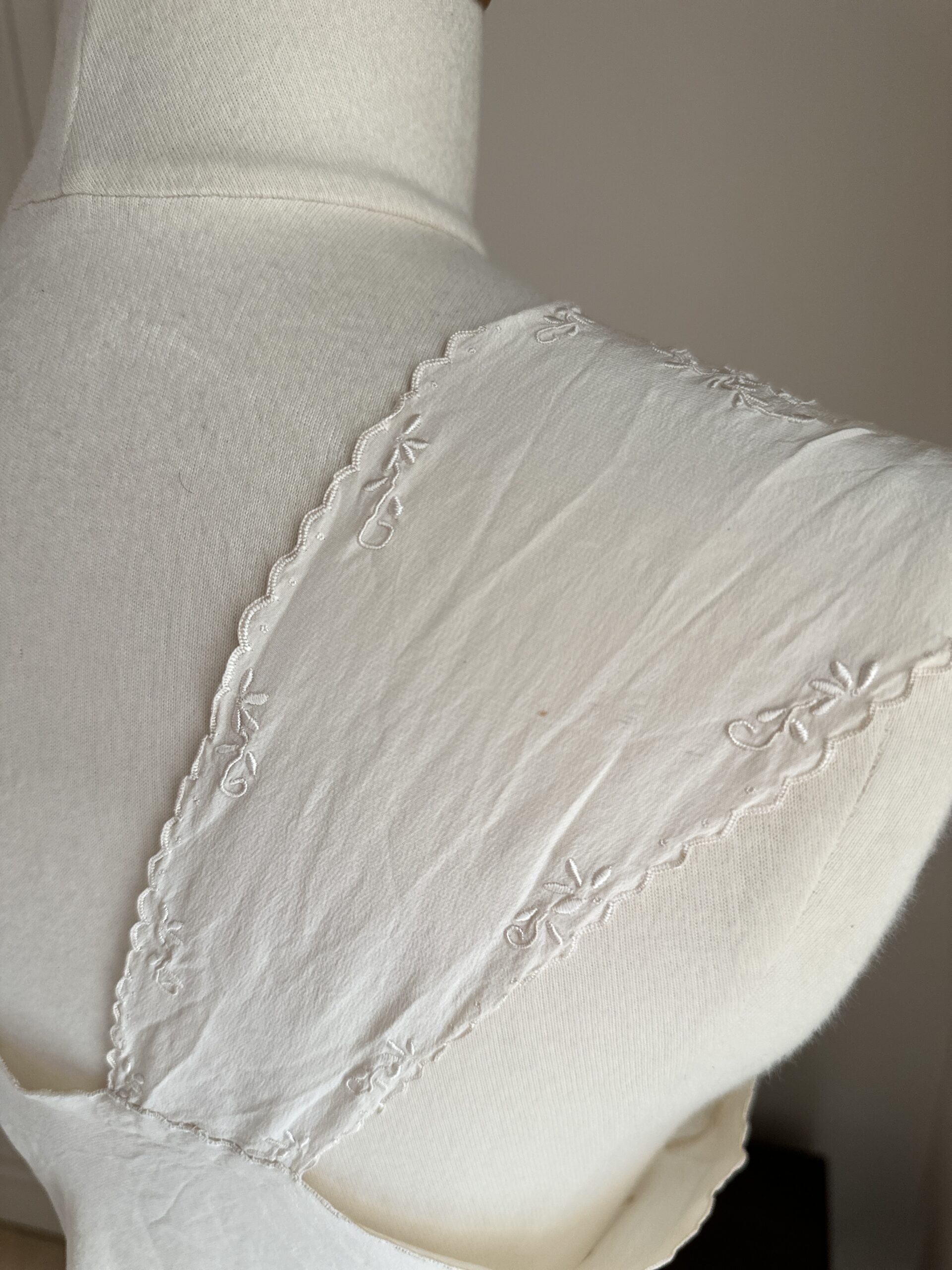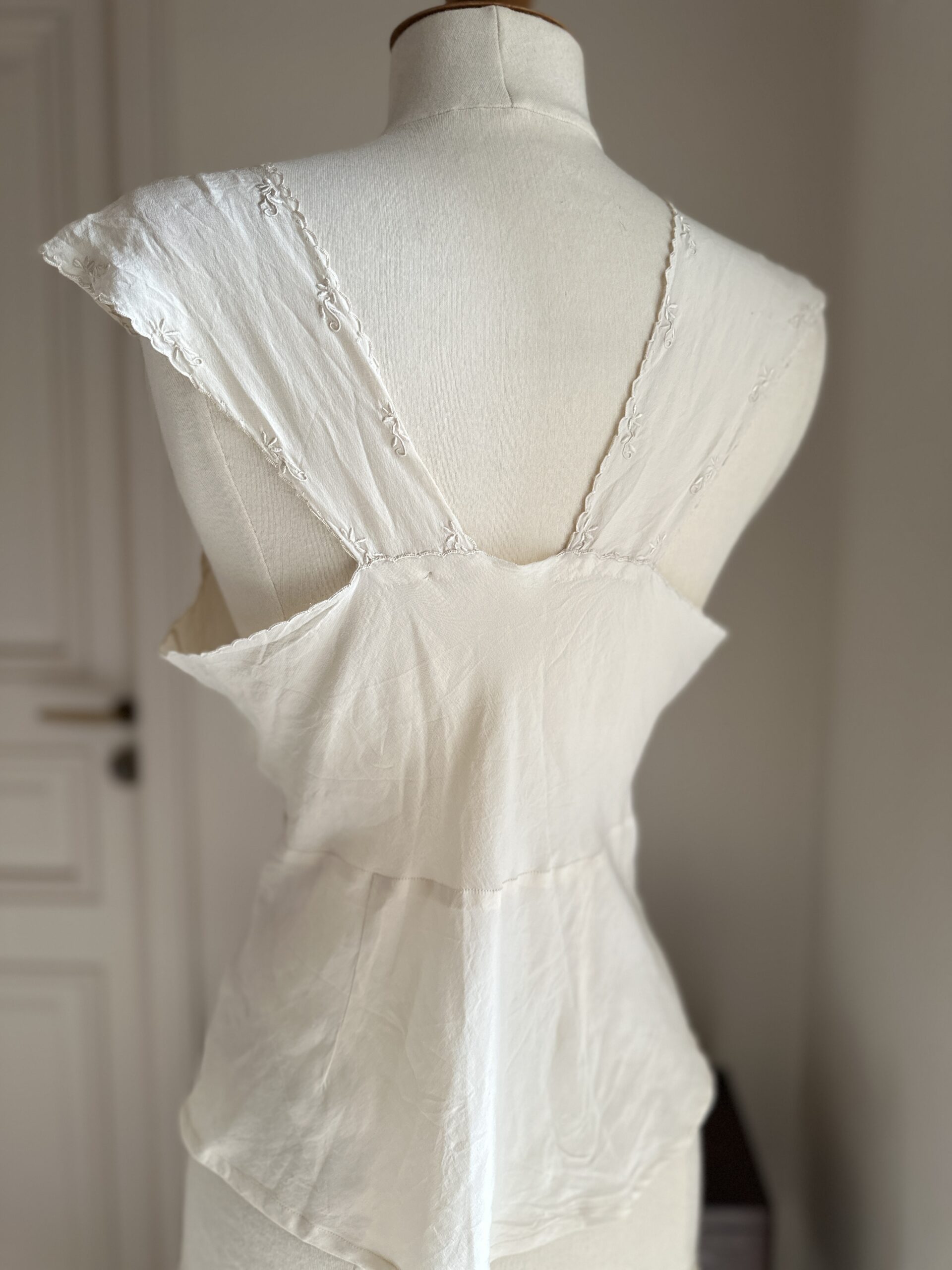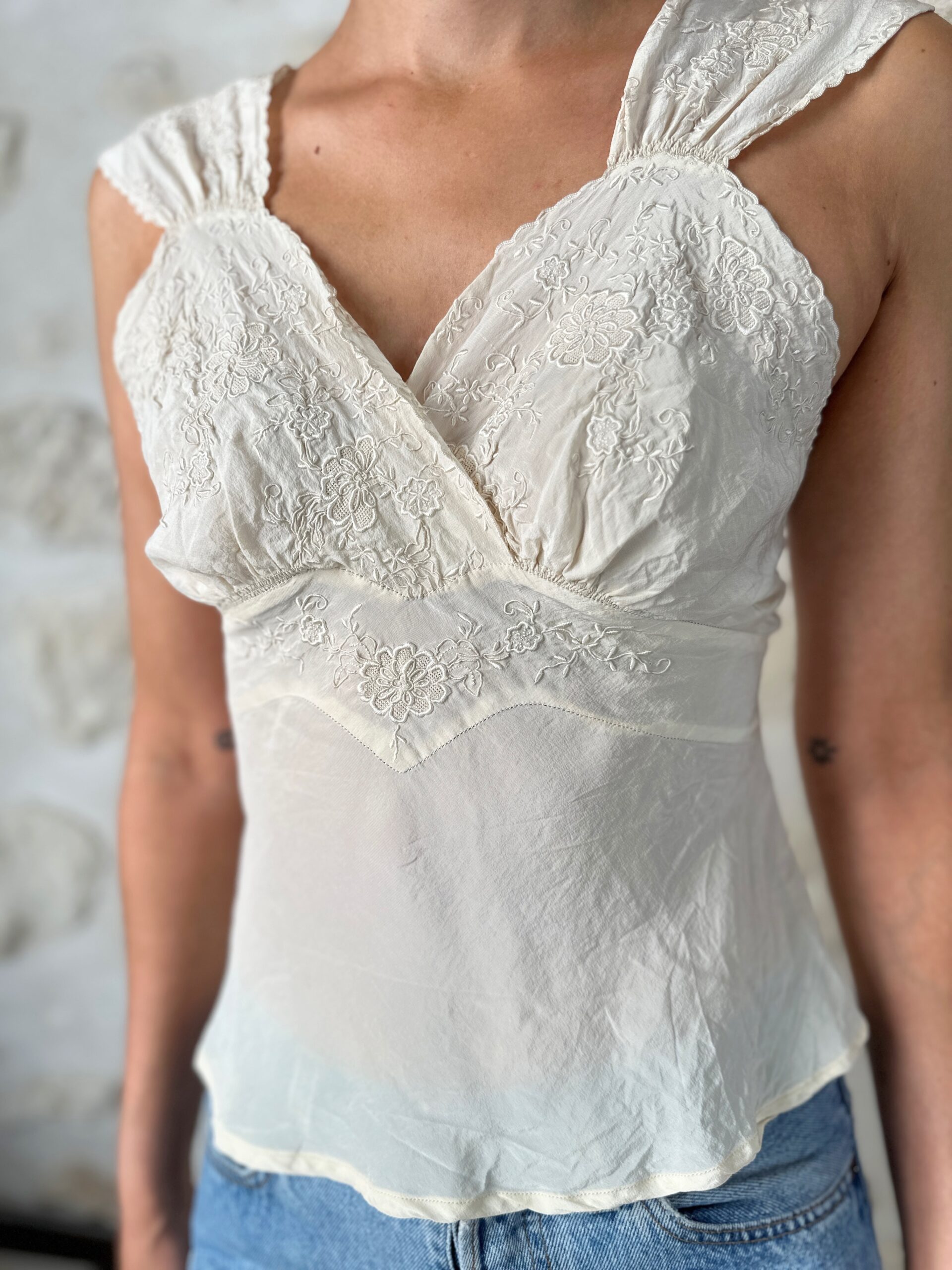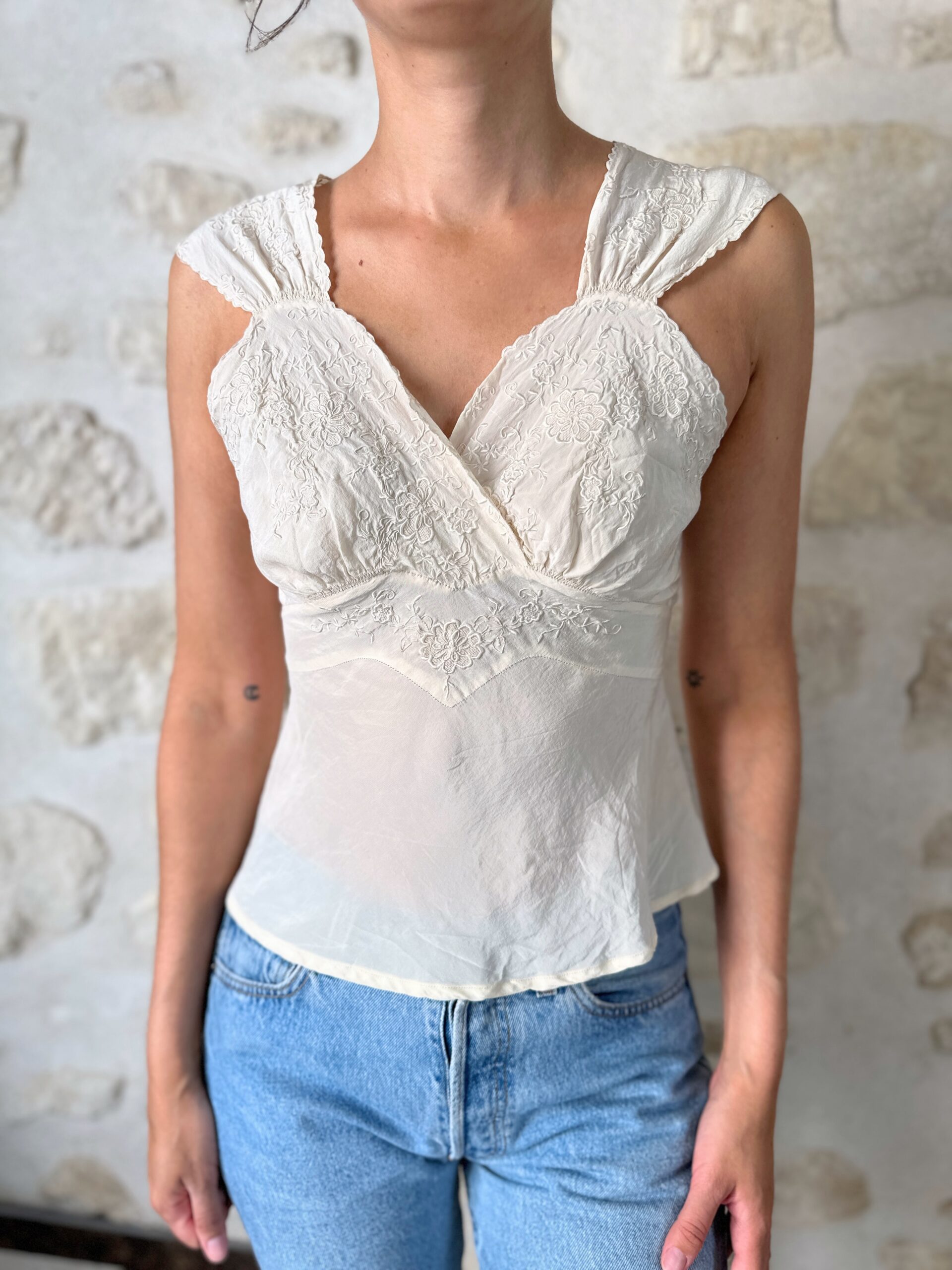 Flowing silk top featuring scalloped sleeve edges and fine embroidery.