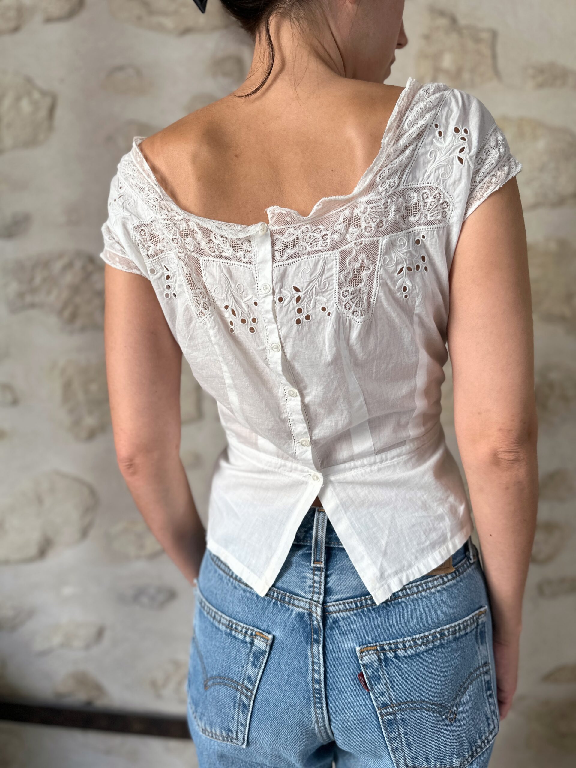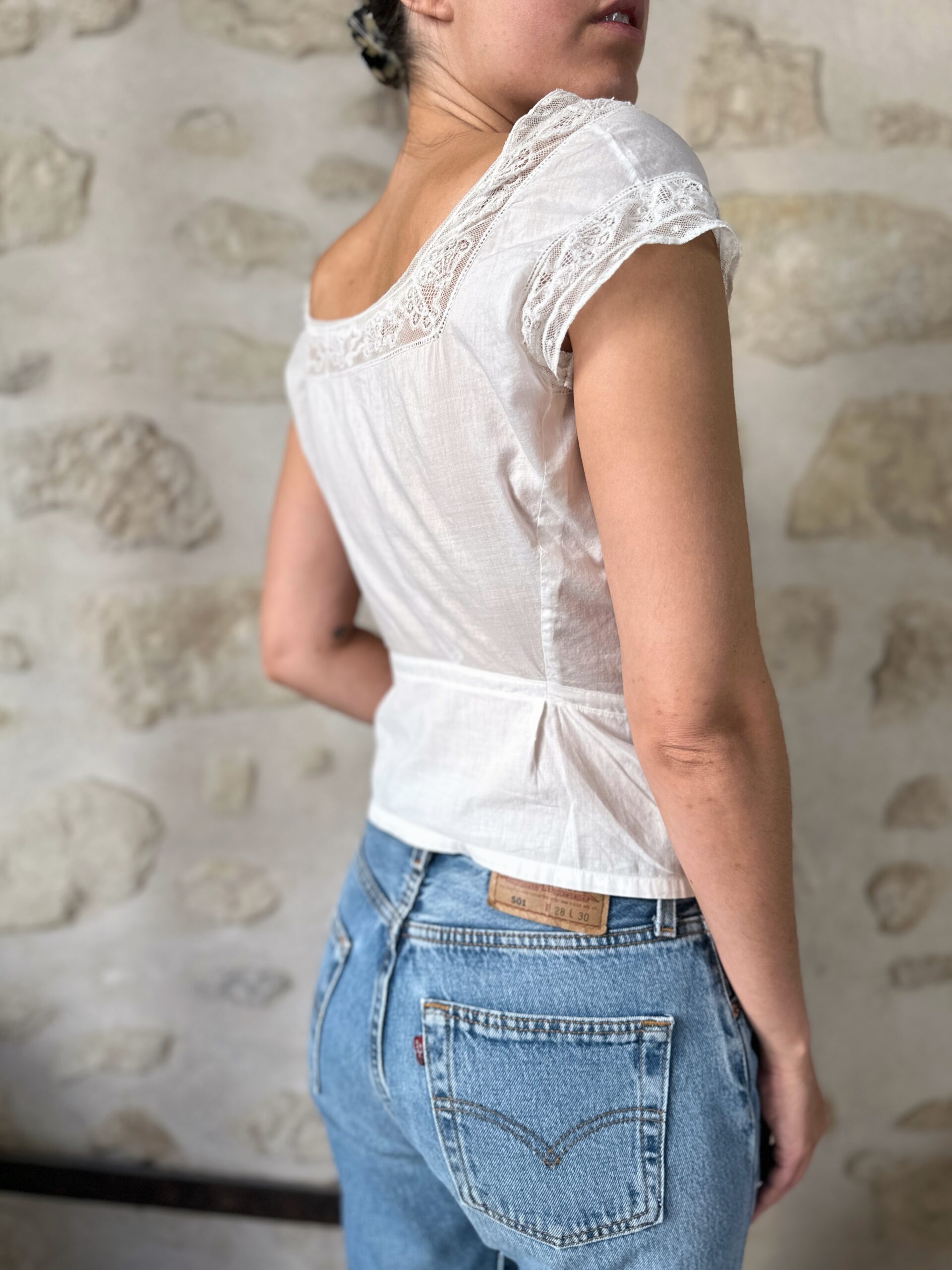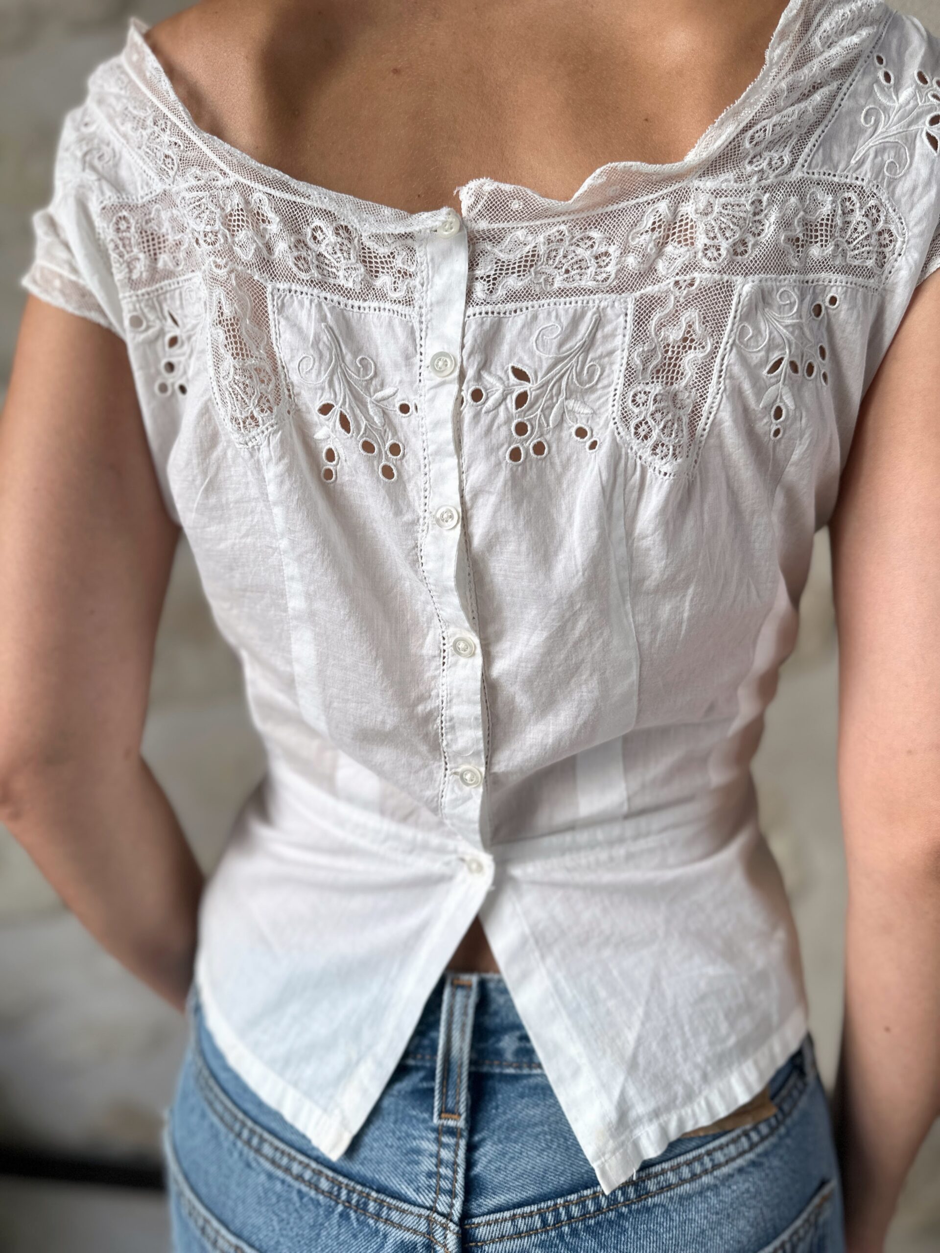 Delicate corset cover, to be worn either way, with buttons to the front for a classic look or reversed for a softer silhouette