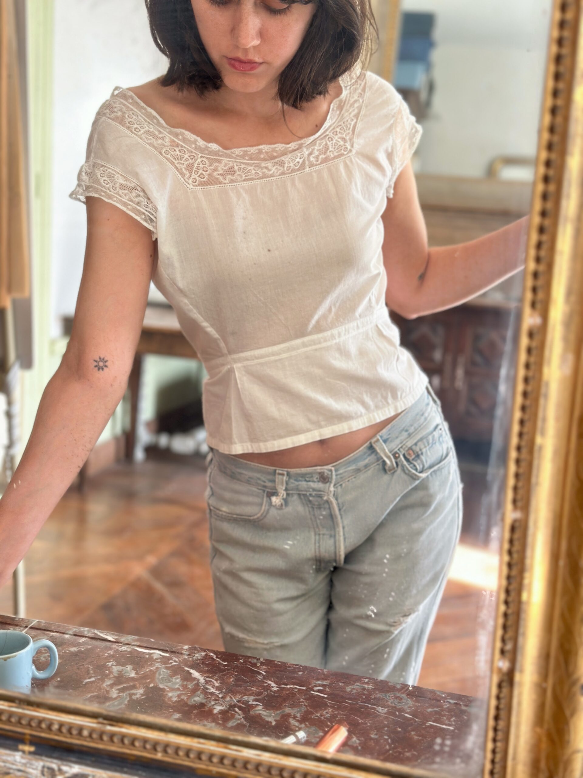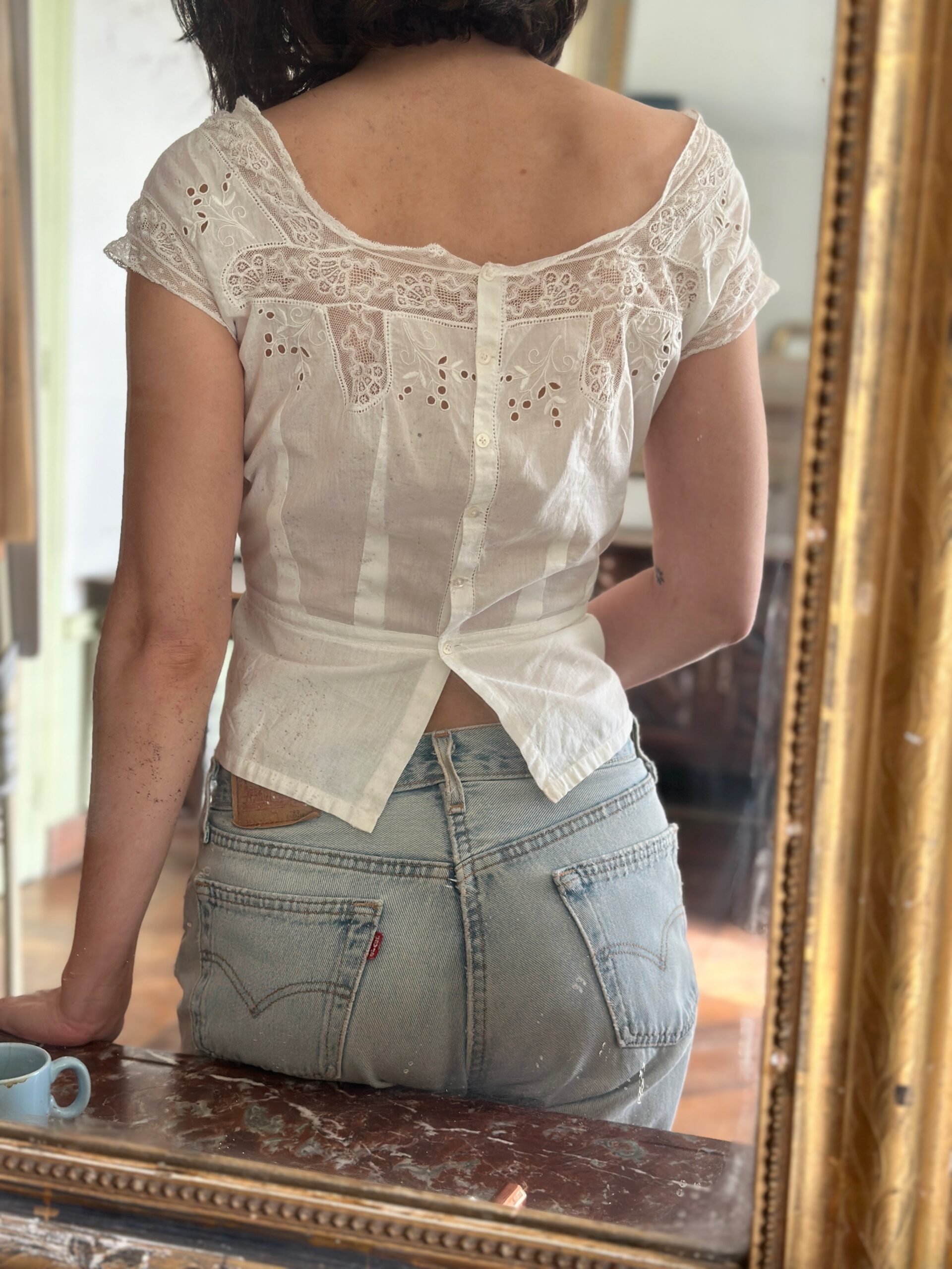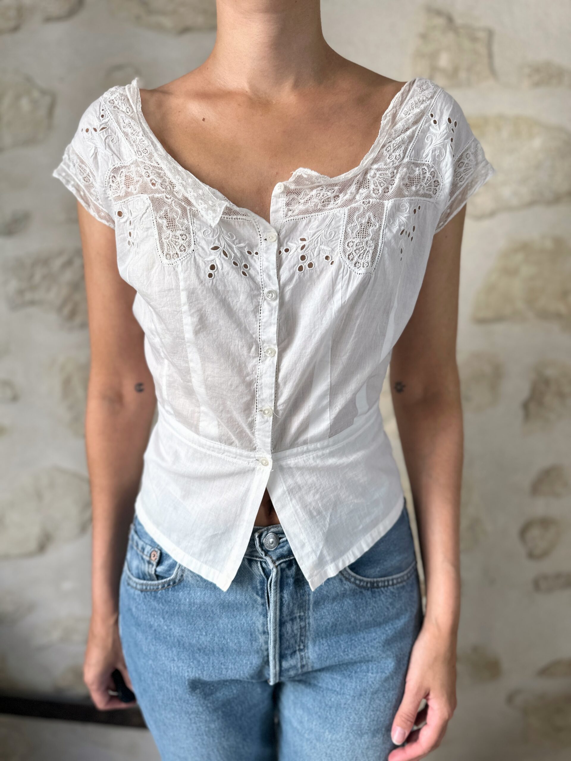 Delicate corset cover, to be worn either way, with buttons to the front for a classic look or reversed for a softer silhouette