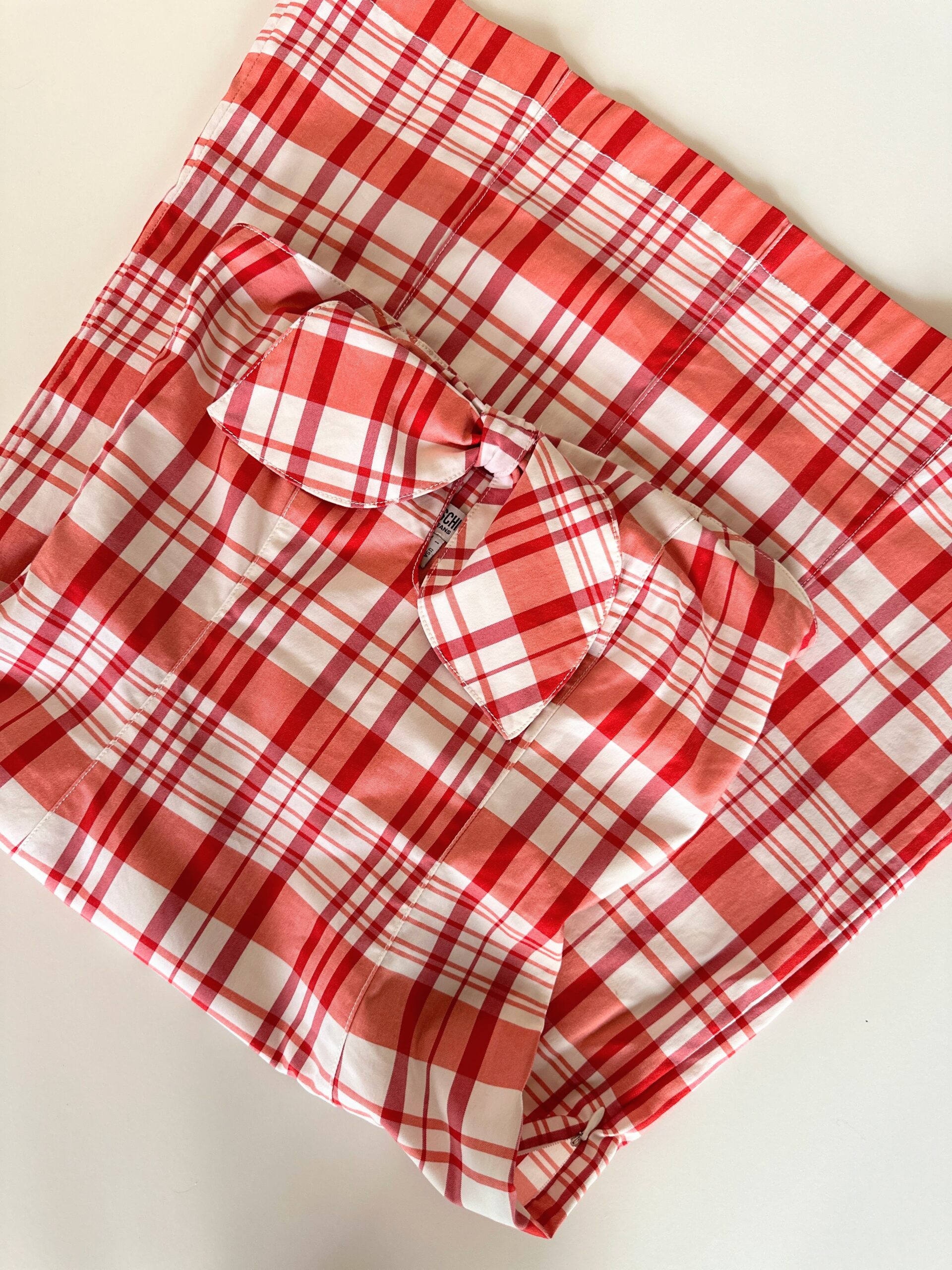 As seen on Charlotte York from the legendary show Sex and the City back in 2002, this vintage Moschino dress features a playful plaid print, a bow-accented sweetheart neckline, and a keyhole cutout at the bust, in a soft pink palette.
