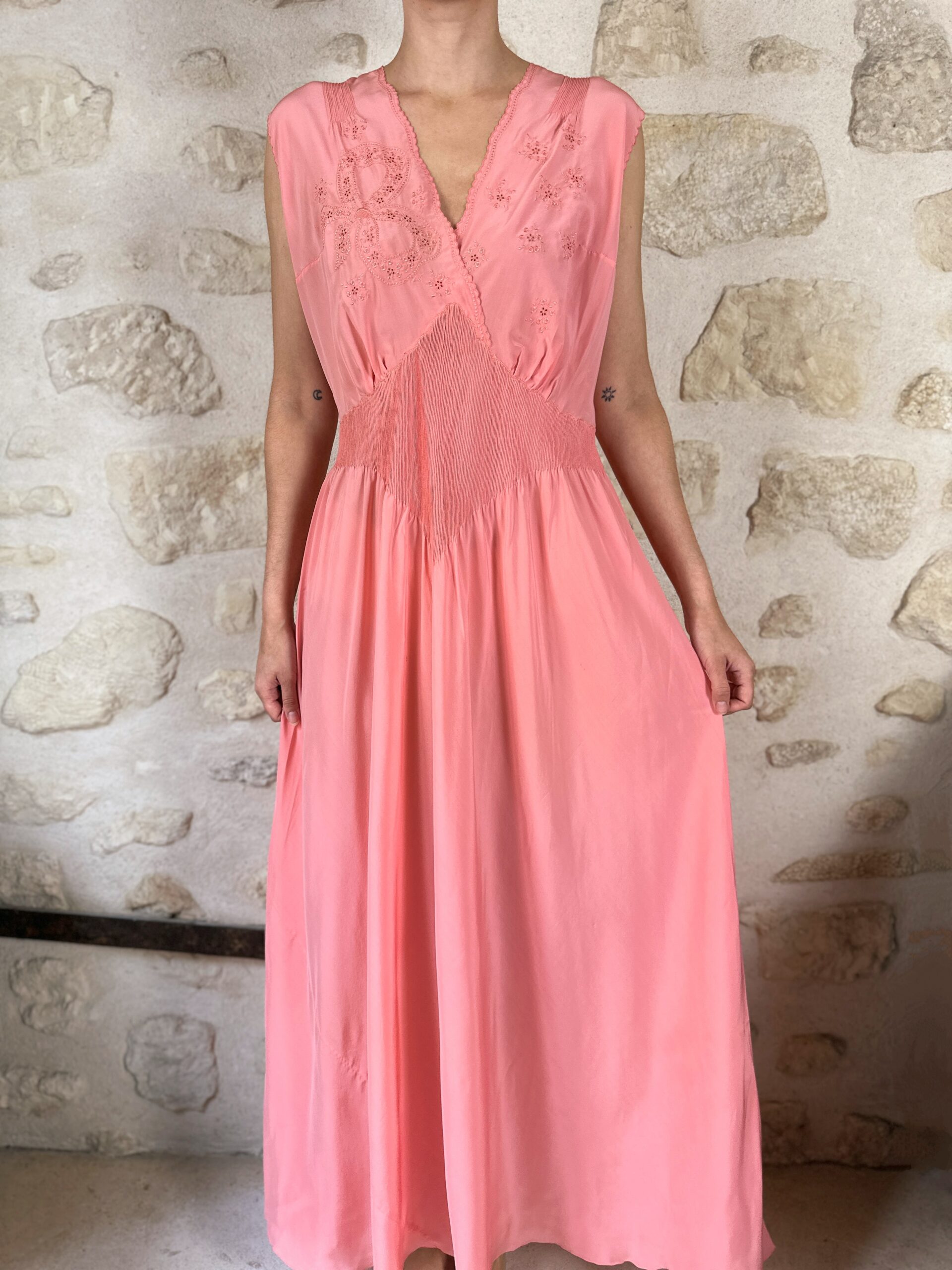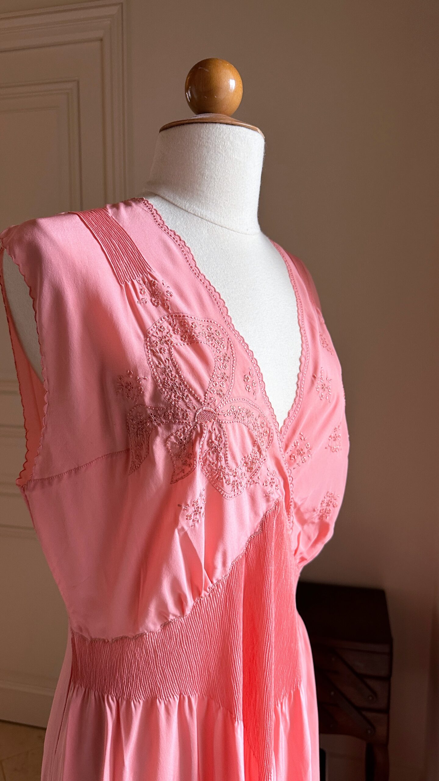 Beautiful vibrant silk nightgown from the old-world. Incredible bright salmon pink with intricate embroidery.