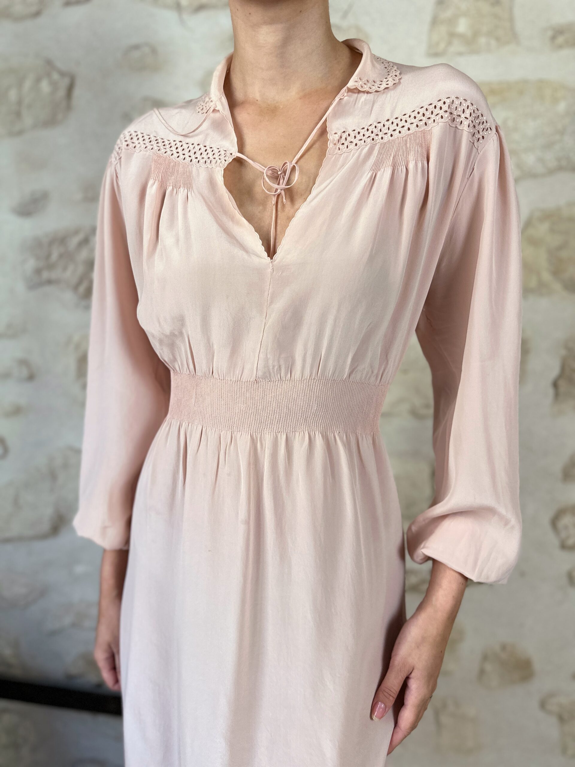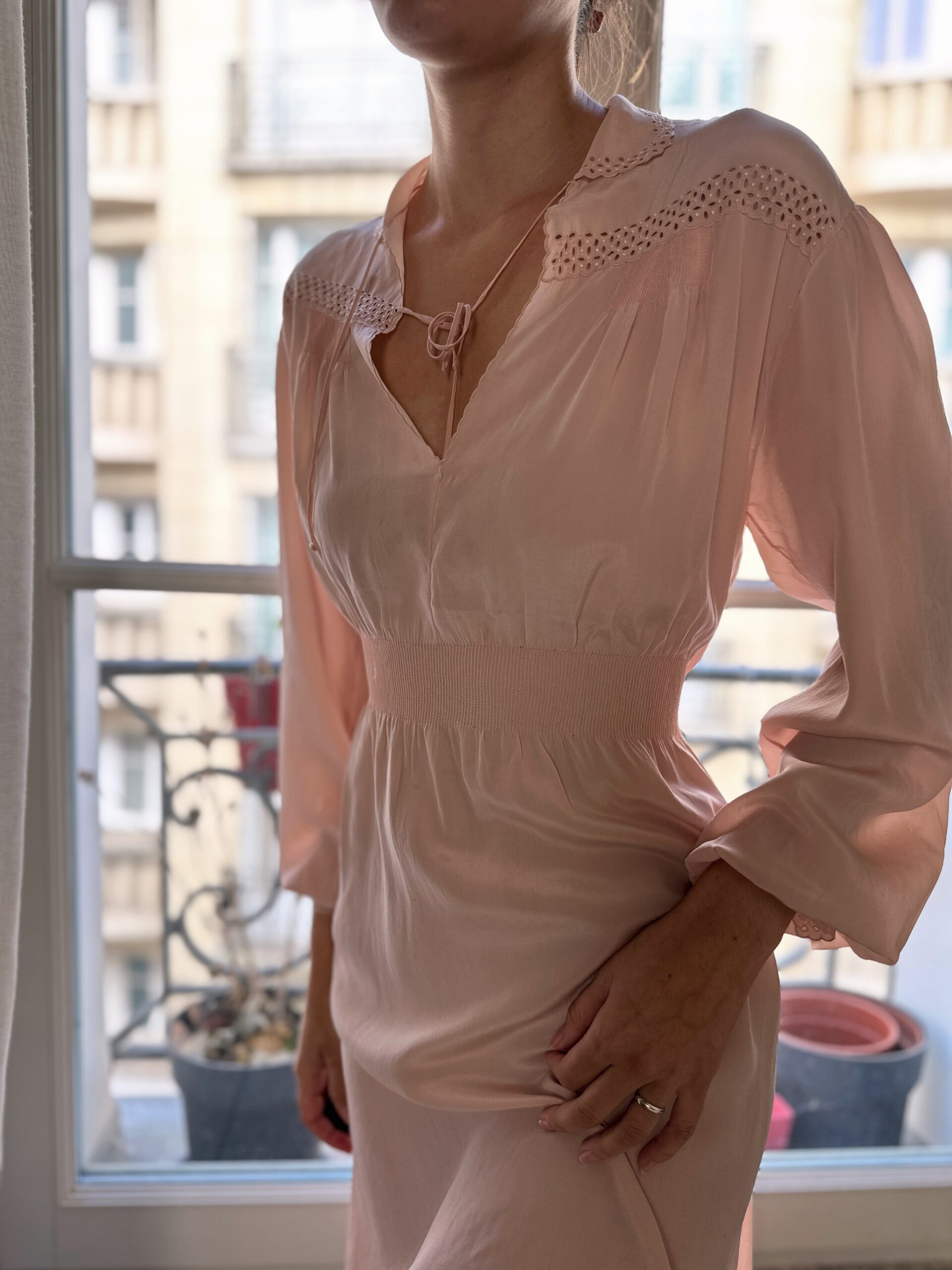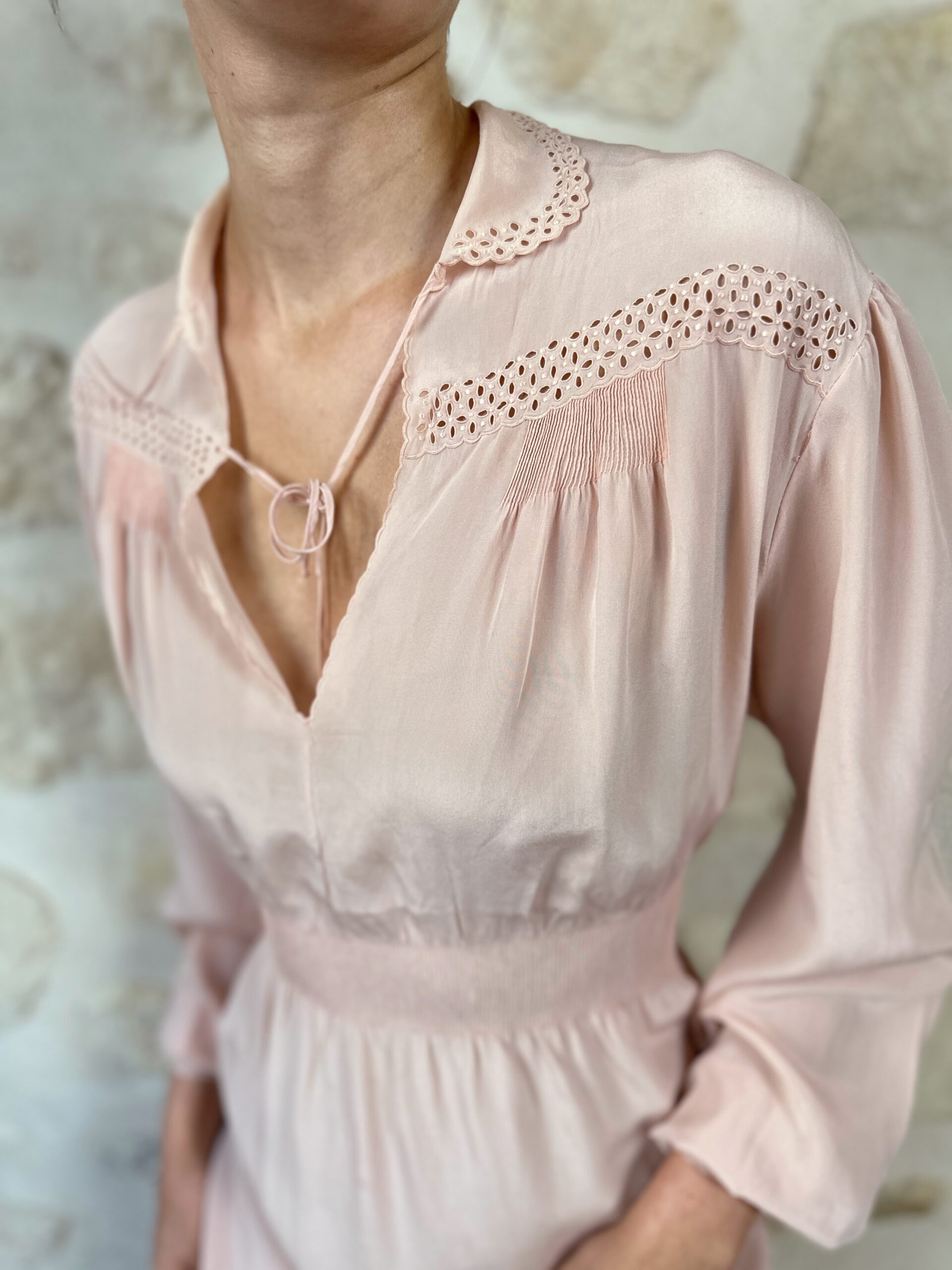 Vintage dreamy silk dress with delicate eyelet lace details and pin tuck pleats.